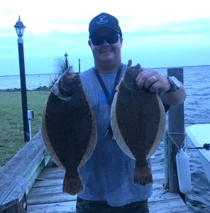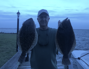 Most offshore boats were at the dock today prepping for the Tuna Tournament, but the bay was full of boats and flounder fishing was good once again. I got out this evening with my very good friend and inventor of the Deadly Double Dale Timmons and we had some luck fishing the east channel north of the route 50 bridge. You can tell by our pics that the tide was late, but the bite was good so it was worth the wait. We caught a total of around 20 fish and had some nice keepers for the box.