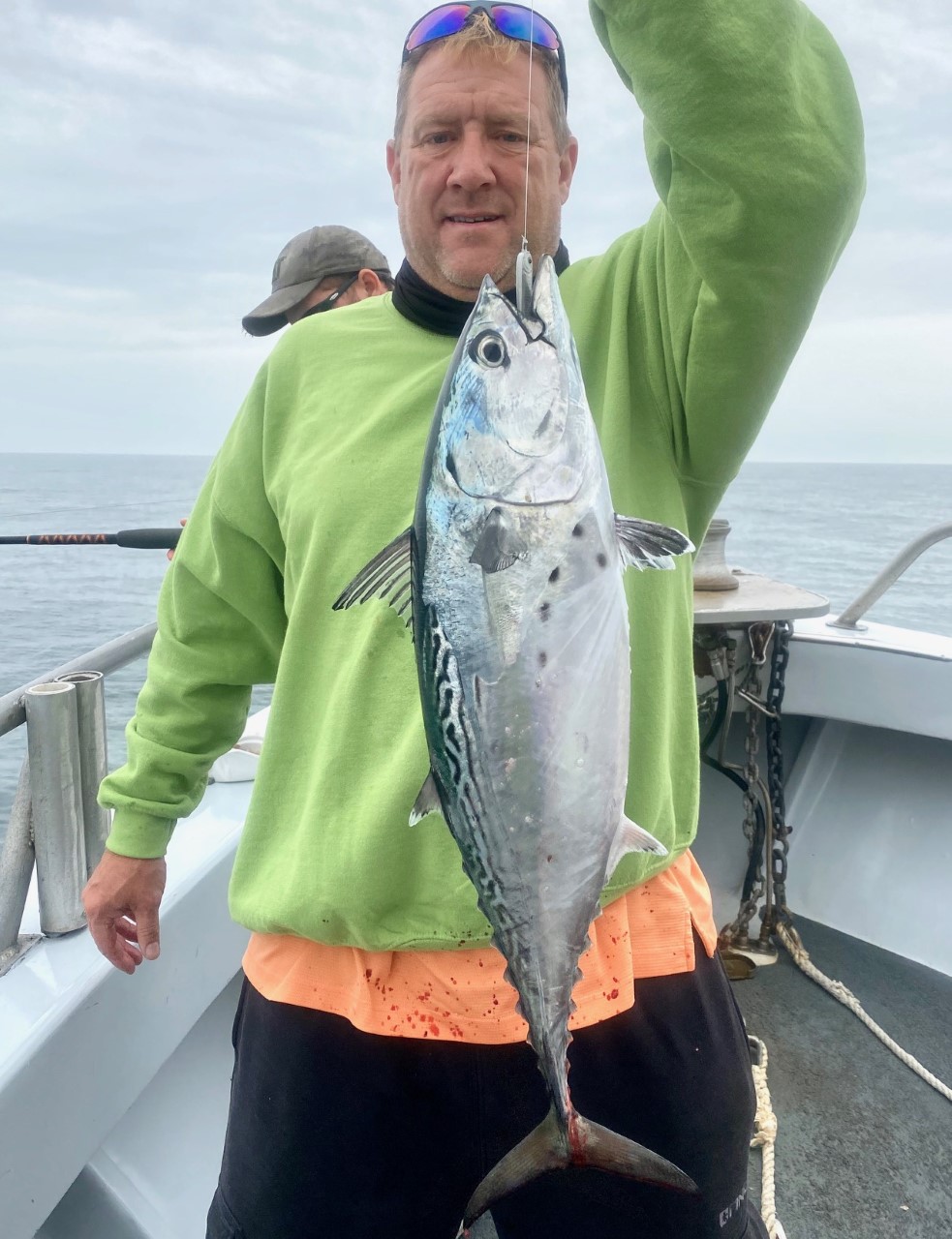 While moving back to make another drift, just jogging along at clutch speed, I’d told Vic to drop a sea bass sandeel jig off the stern — Fish On! — nice albacore too. Went ahead and did that a while. Everyone who wanted the work caught one. Last several were on a light mahi spinning rod – good exercise, promise.