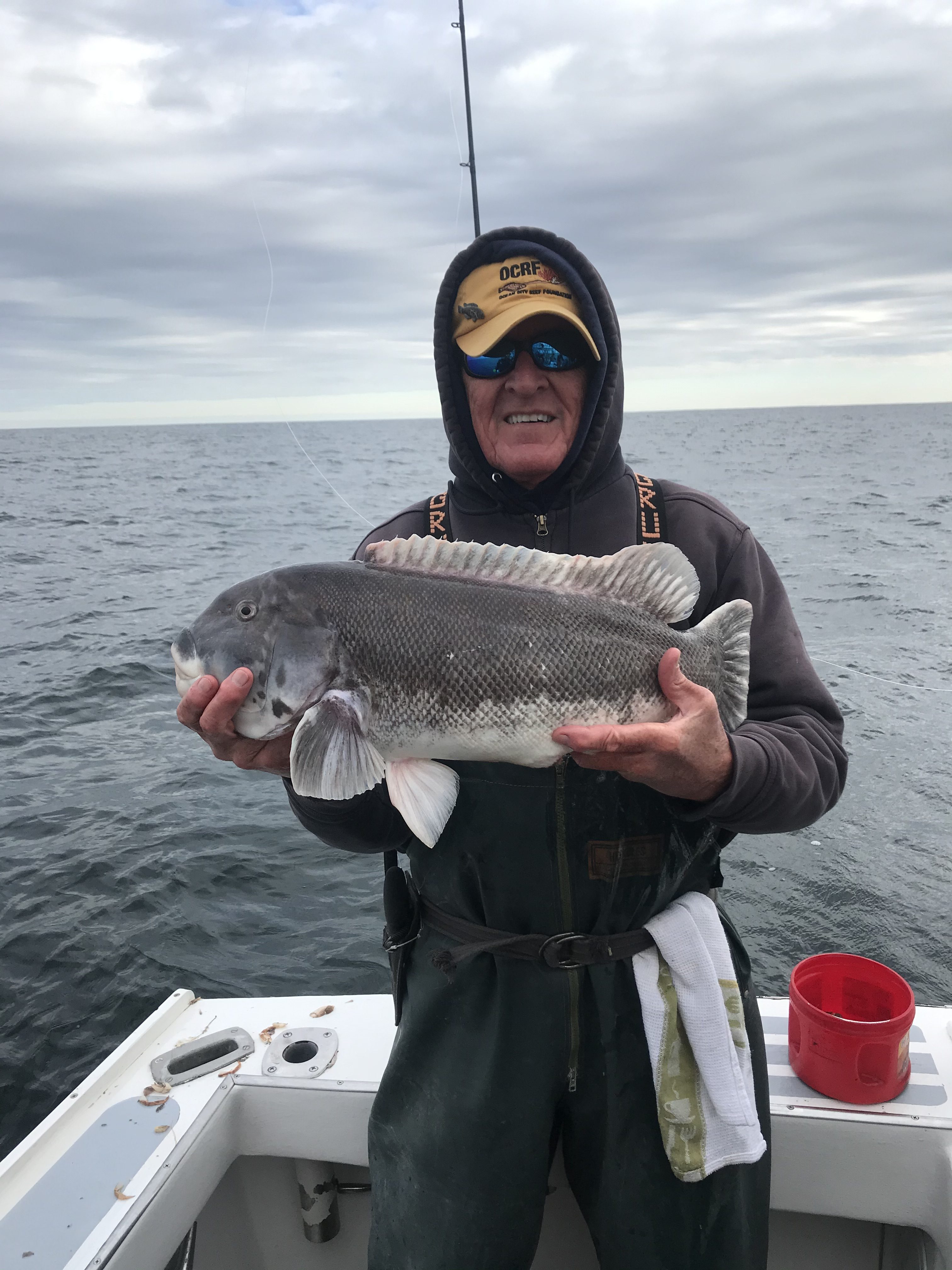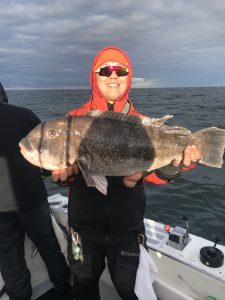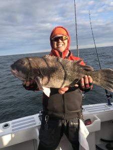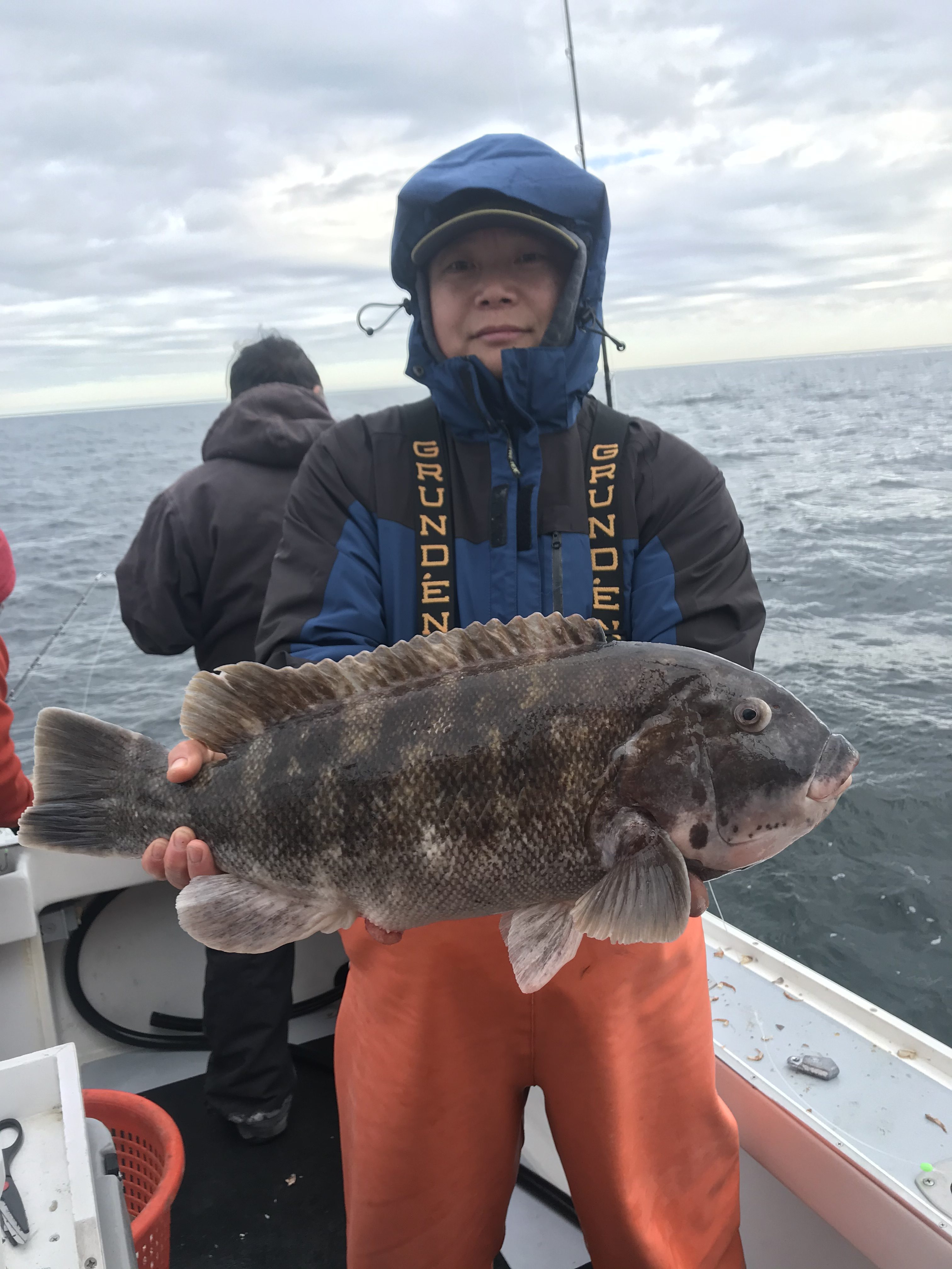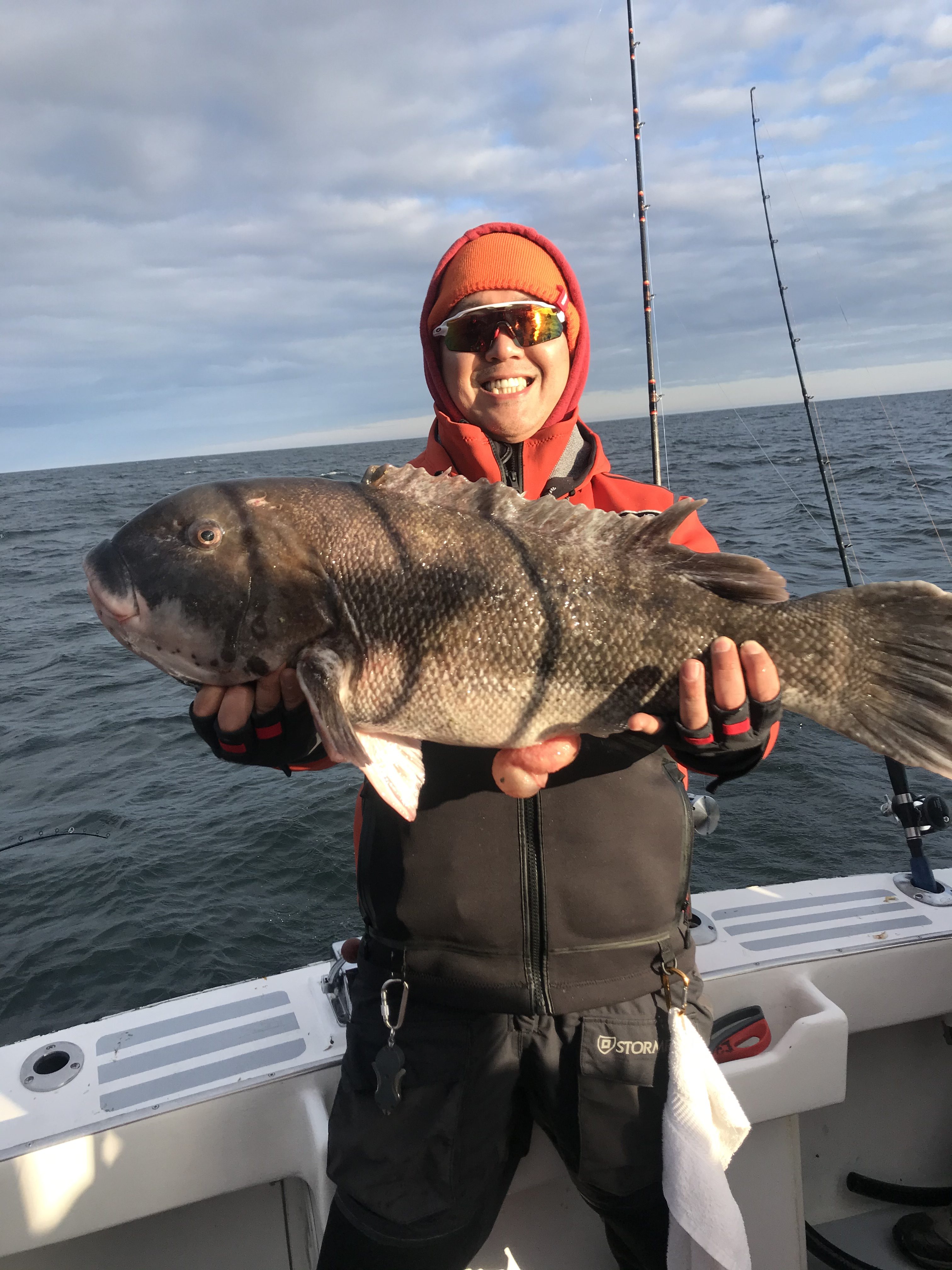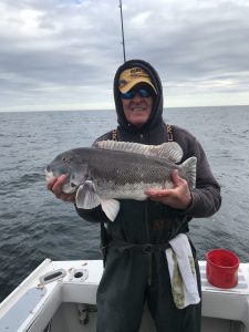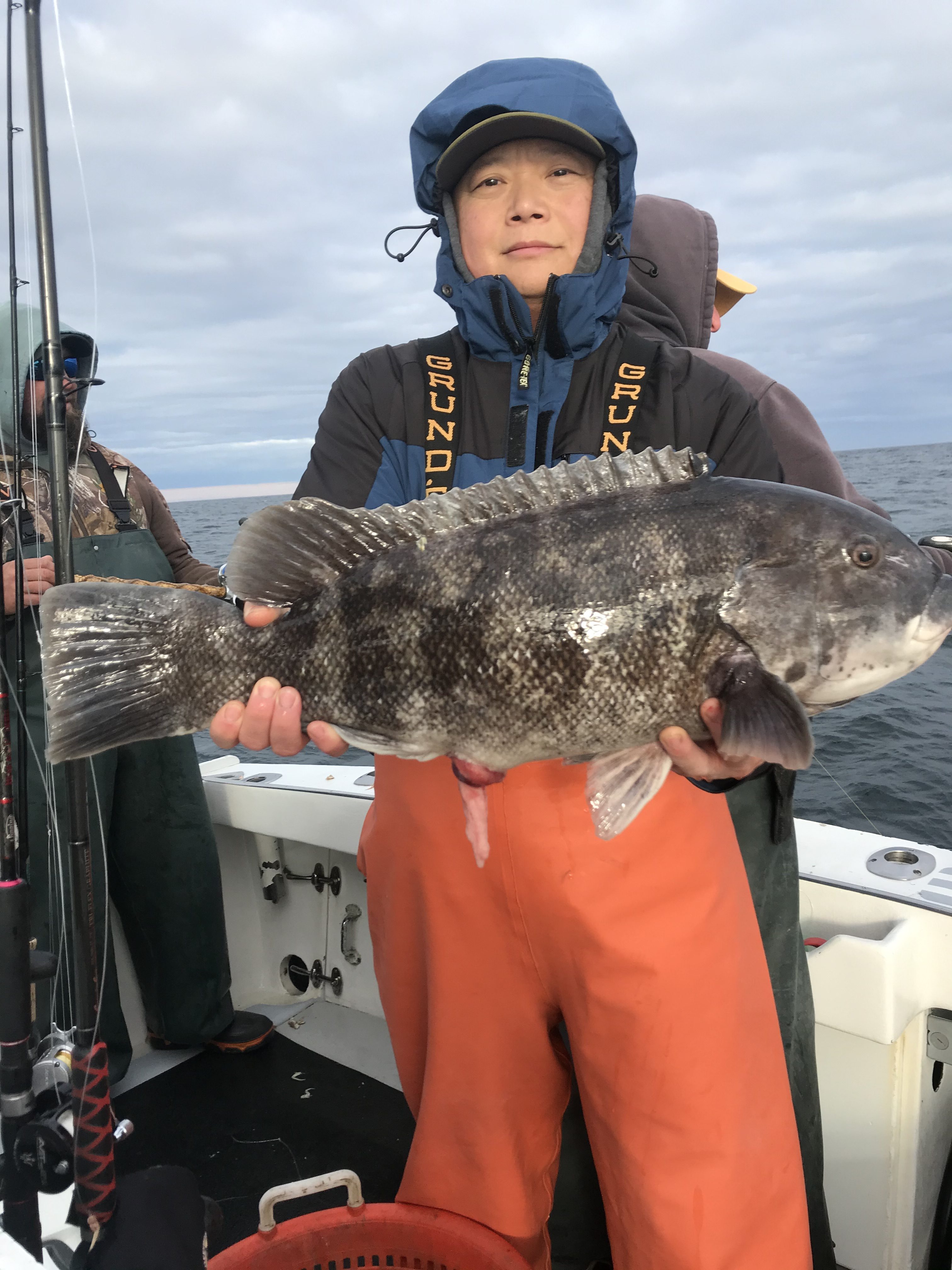 I got a good fishing report from Captain Kane Bounds of the Fish Bound on the way home with a couple of pics of some jumbo tog. Captain Kane reported a beautiful day on the water, but the tog were fussy to start things off. They moved around and found some hungry fish where they landed several nice fish and released some big ones. Chan Park had the largest fish of the day at 15.5 pounds which was released. The crew also released a 9 pound fish and another of more than 10 pounds. The guys worked hard and got it done and ended the day with 18 nice fish for dinner.