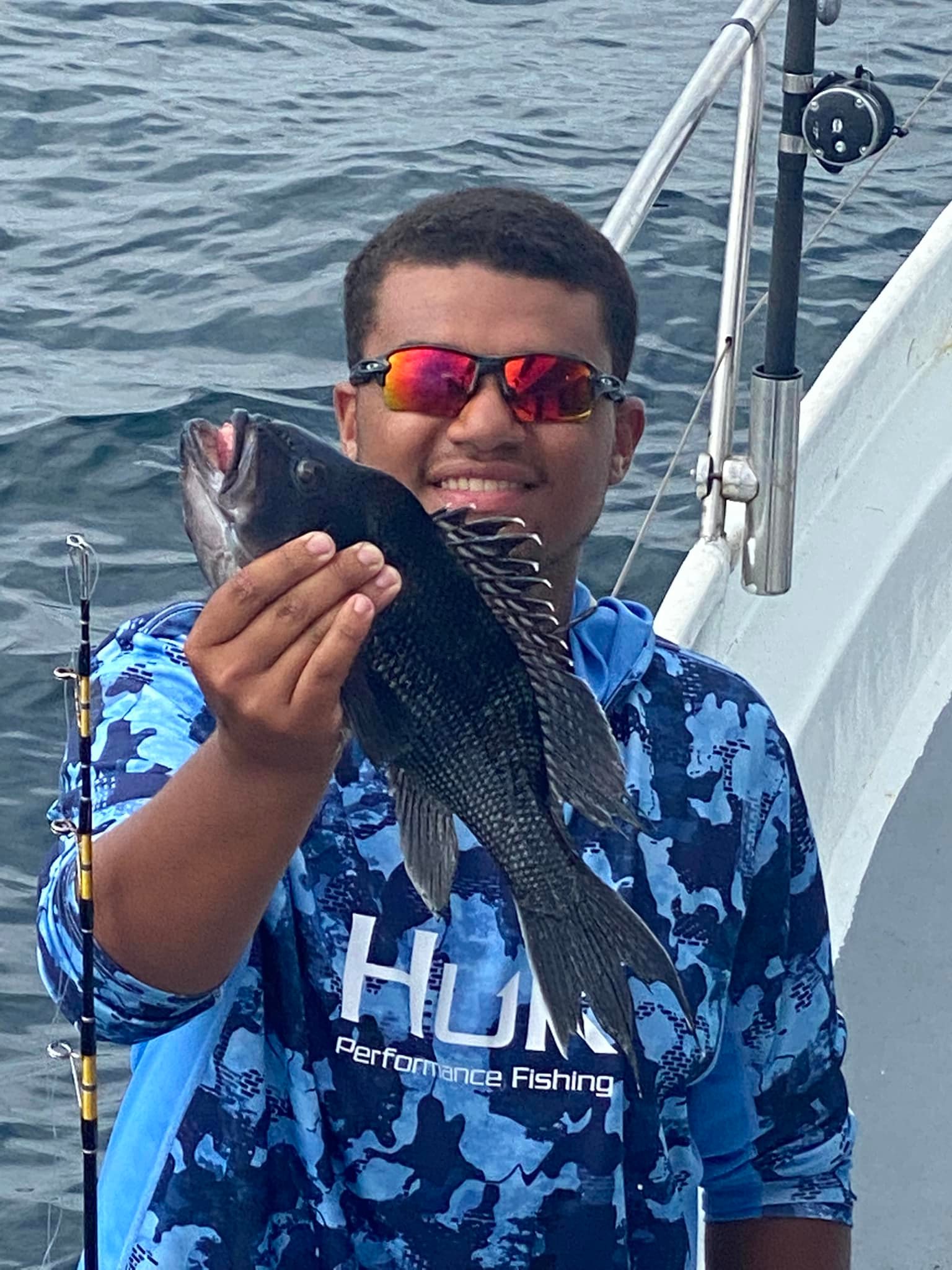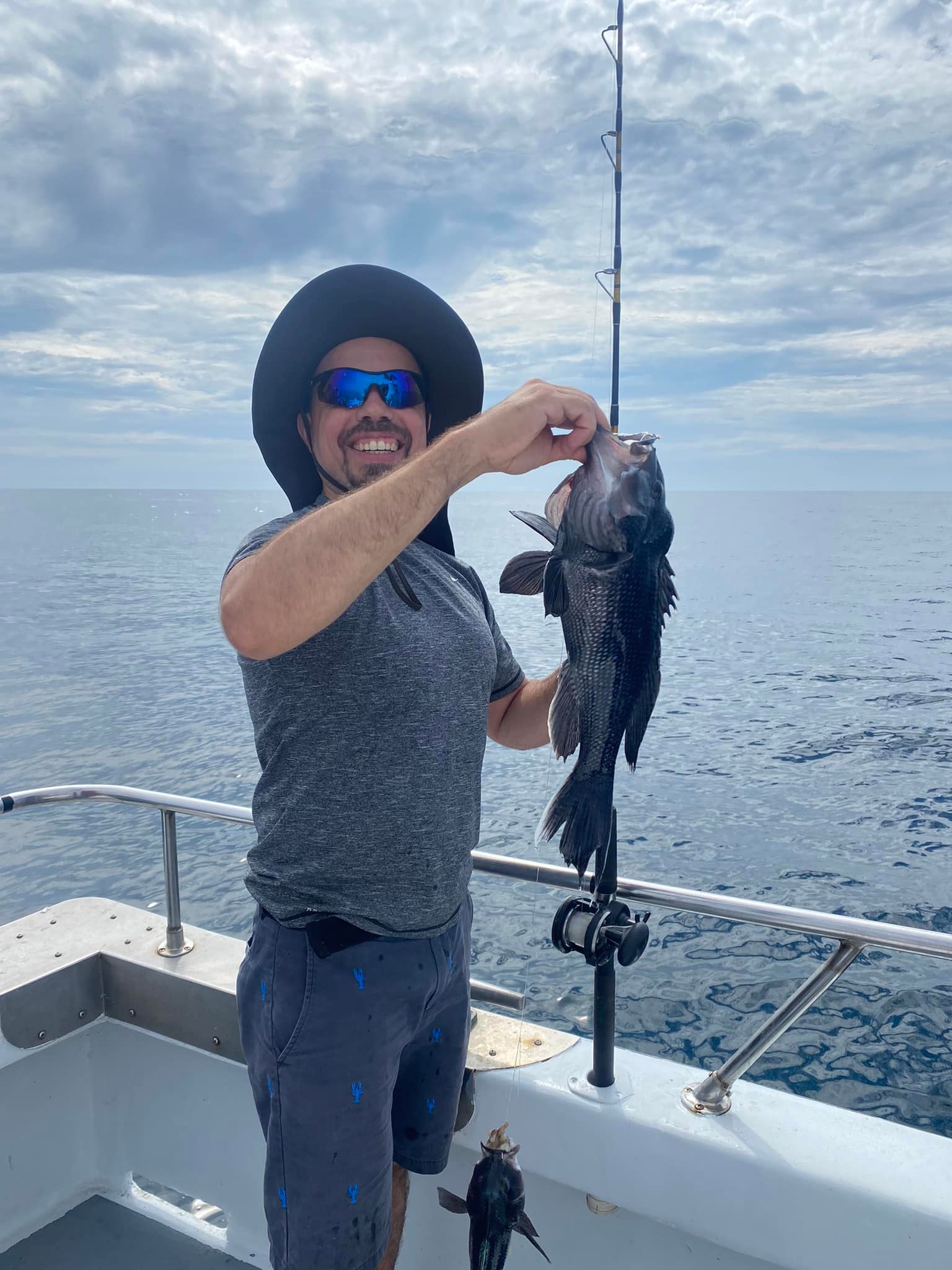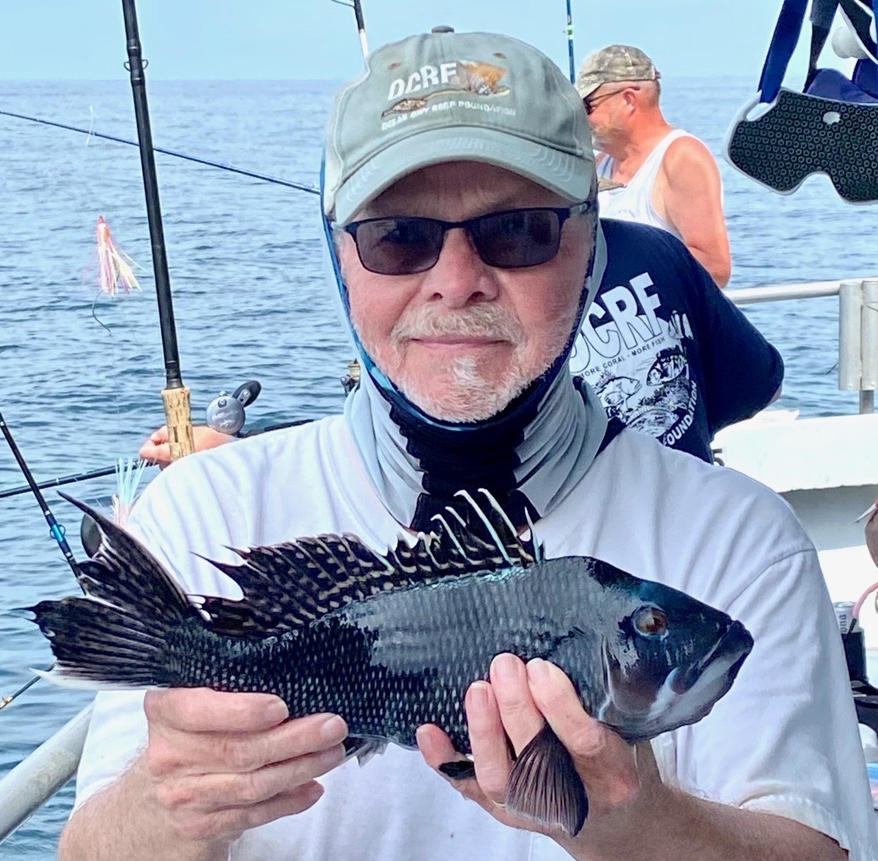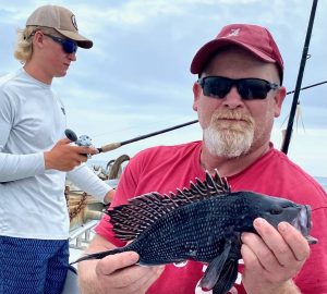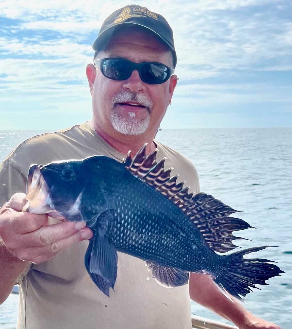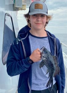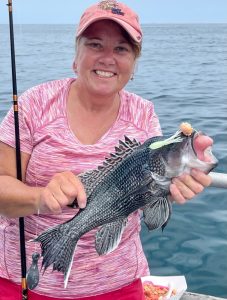Captain Chris Mizurak of the Angler stayed dry almost all day and the sea bass bit well for his crew.