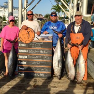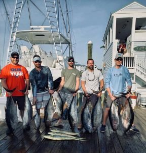Like I said at the top offshore fishing was tougher today than it has been for the past few days. One boat that was able to find them though was the Boss Hogg with Captain Brian Porter. Jeff Williford, Justin Windsor, Nick Toms, Cody Wachter and Rhino Chrome reeled in 10 Yellowfin and 3 Dolphin on a flat calm day offshore.