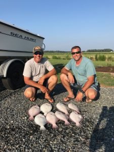 I saw at least one of the fish get netted that Bill Powell and Greg Plaskon caught today. The guys had 30 throwbacks and eight fat keeper flounder on Gulp and bull minnows in the north end of the south bay and in the east channel.