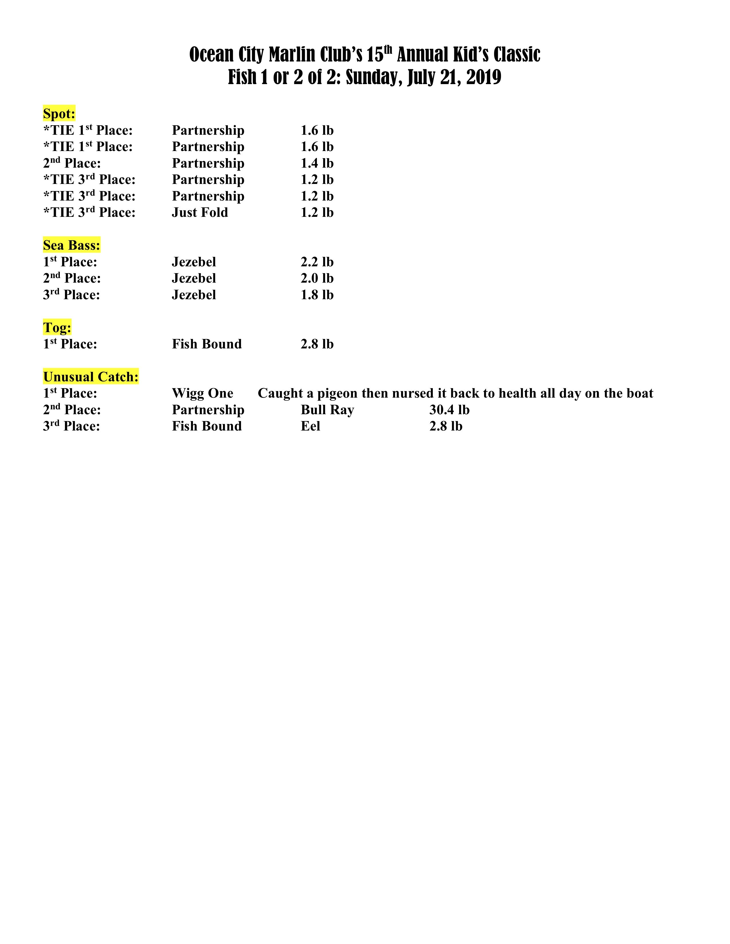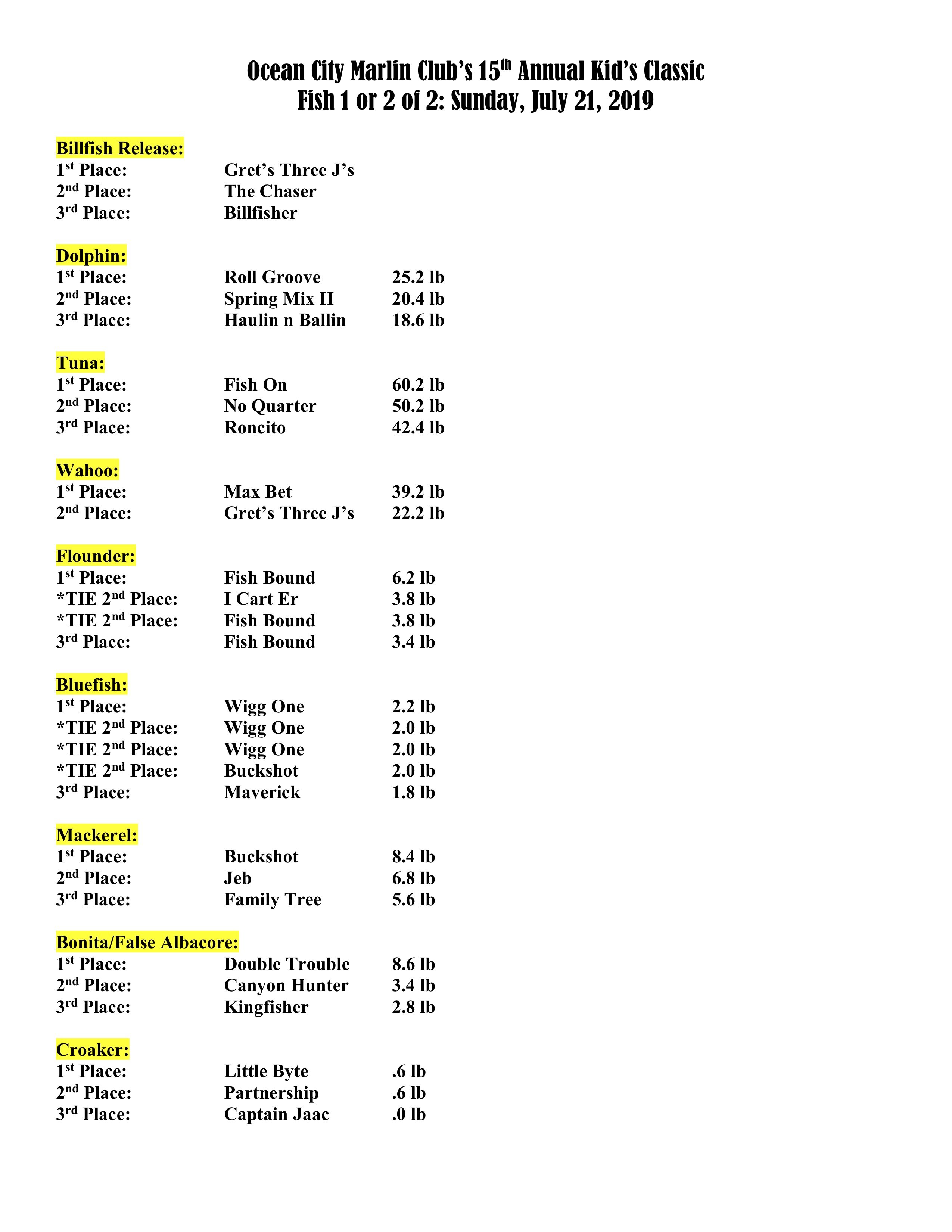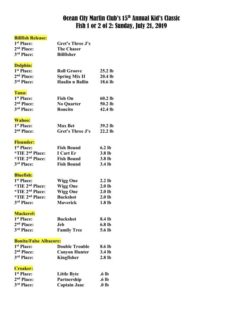 Today was the 2nd and final day of the 15th Annual Kid’s Classic Tournament put on by the Ocean City Marlin Club and it was the close of another awesome event. Over 300 kids participated and they did a great job landing a bunch of fish. Here are your winners….