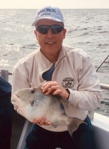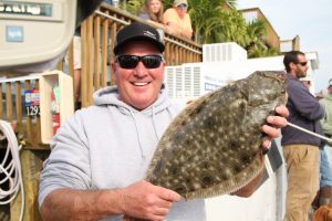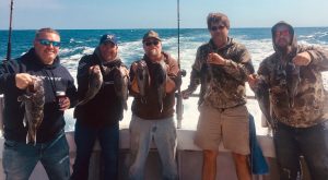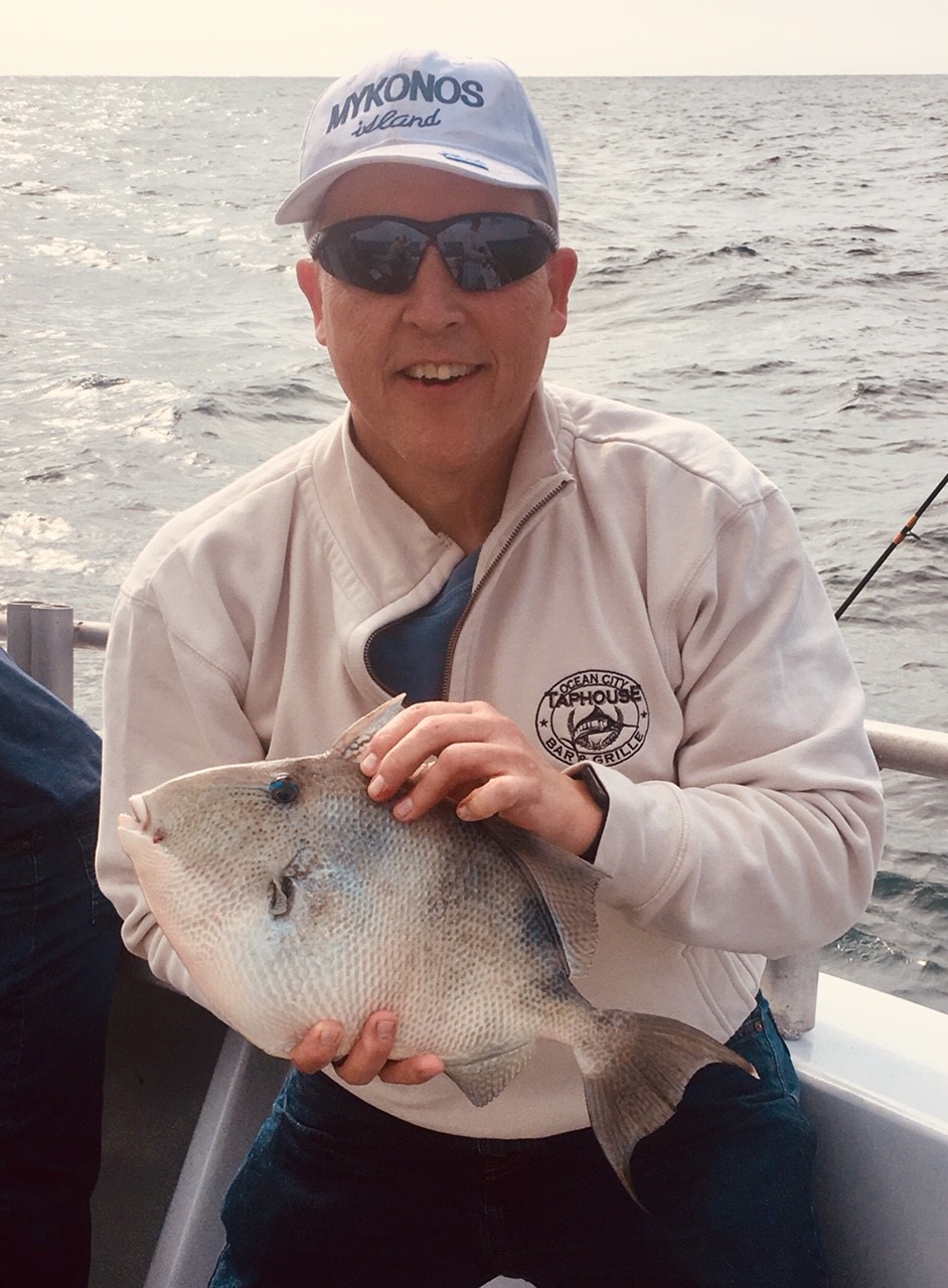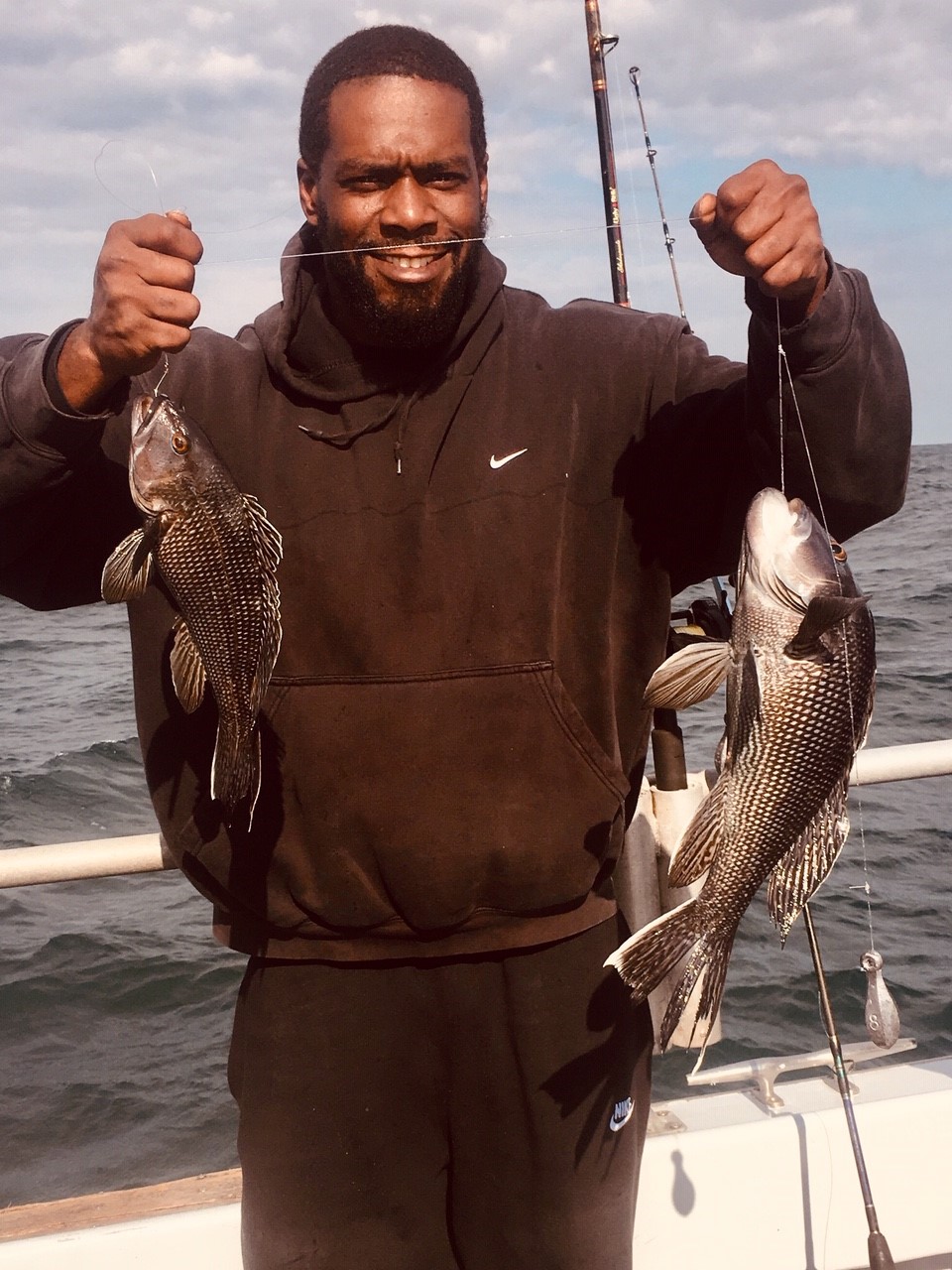 Amir Smith (black coat) of Harrisburg PA shows off a nice keeper double of sea bass. Young Nathan Rains of GlenBernie MD & Larry Hawington from Gaithersburg MD show off some of today’s triggerfish – Patrick McKenna (grey sweat) and Paul Squatrina (orange collar) of Baltimore show off keeper doubles – Sammy Keller of East Port MD got into a giant false albacore on the way out –