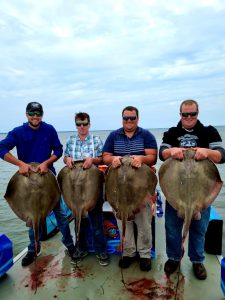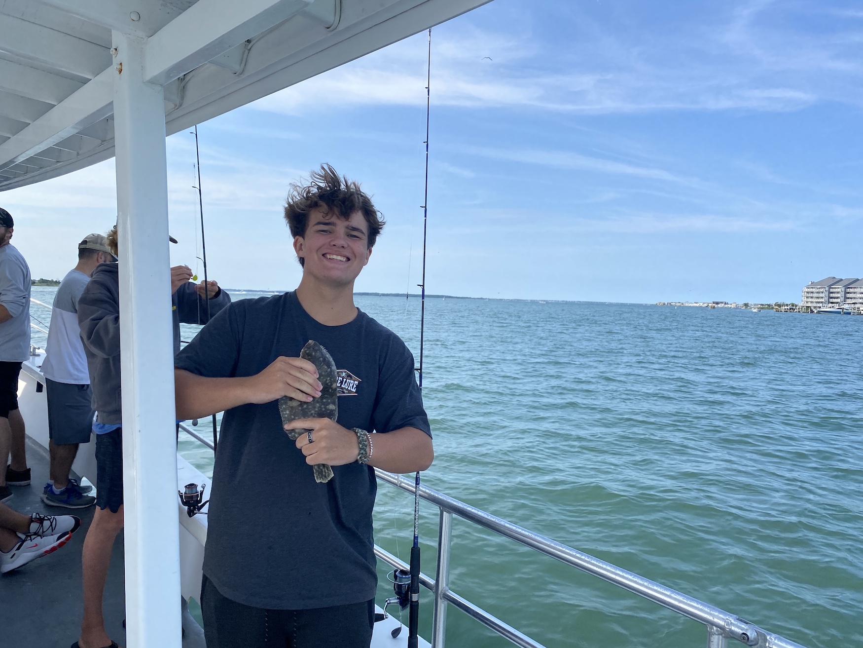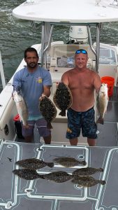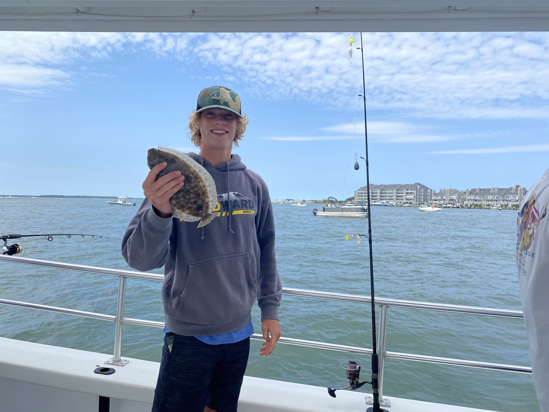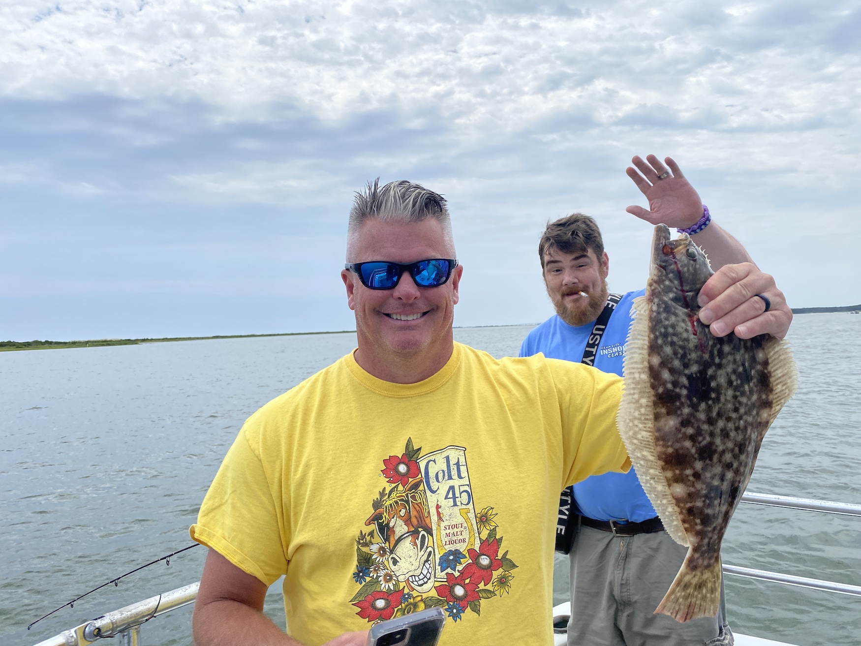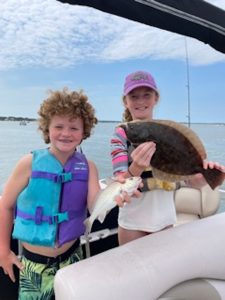 Rilee and Chase Neumayer fished on the Terrible Towel with Gary and Shirley German where they caught several throwback flounder and some croaker. Here they are pictured with a 17″ keeper flounder and a keeper sized croaker that went into the fish box.