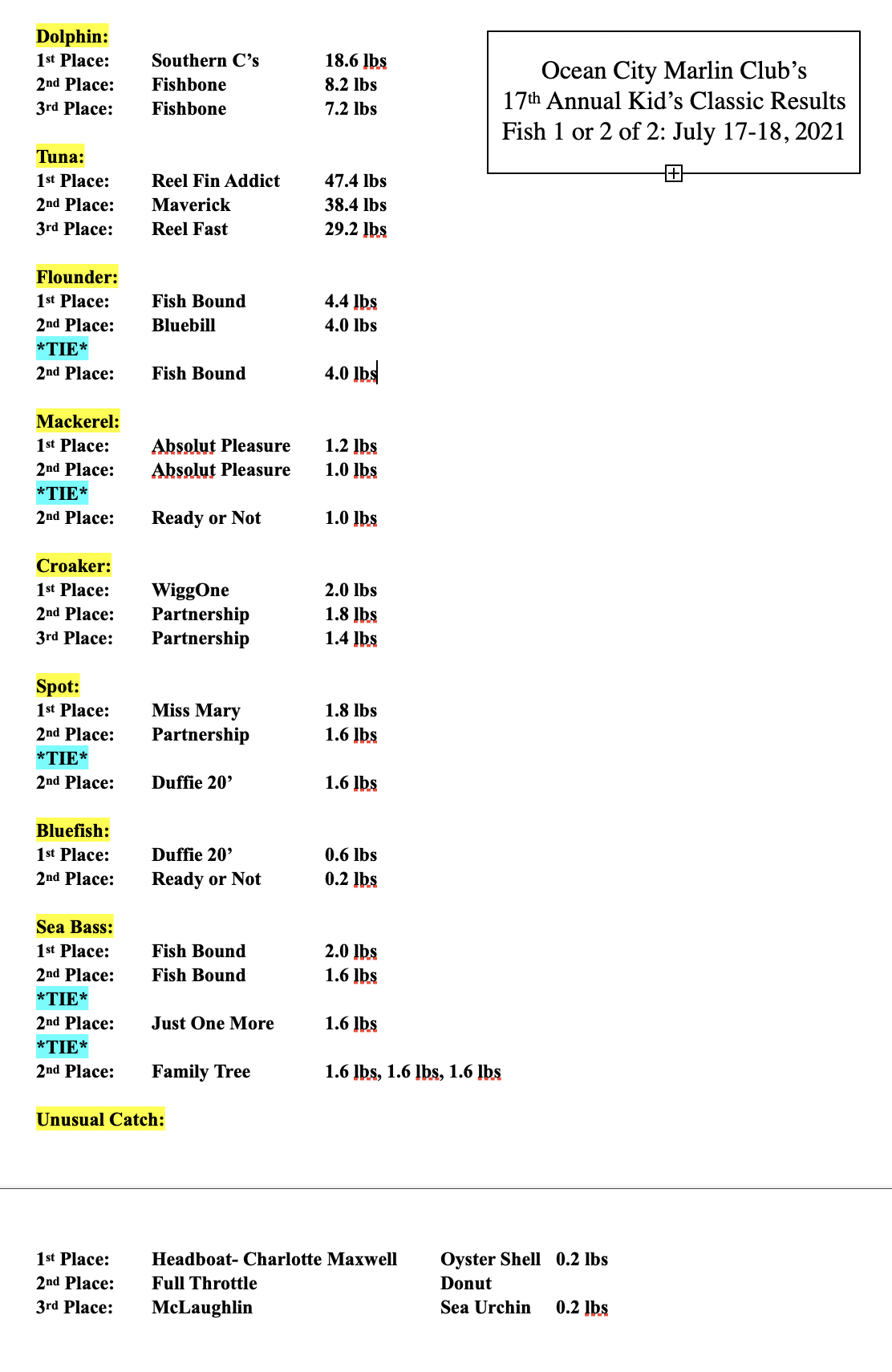 Congratulations to all of the Jr. anglers and teams that fished this year’s Kid’s Classic Tournament and congratulations to the Ocean City Marlin Club for an awesome event. Thanks to Amanda Shick for the pics!