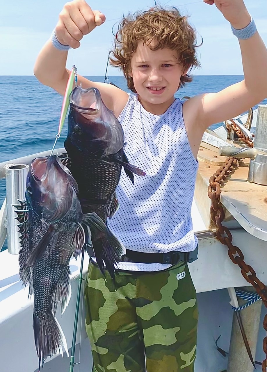 Young Owen and his Mom, Julie made their first tag-team venture seaward. They did a fine job launching 20 reef blocks by the rail &, later, catching two at a time. Owen landed a double on the spoon that would make most of my jigging clients jealous.