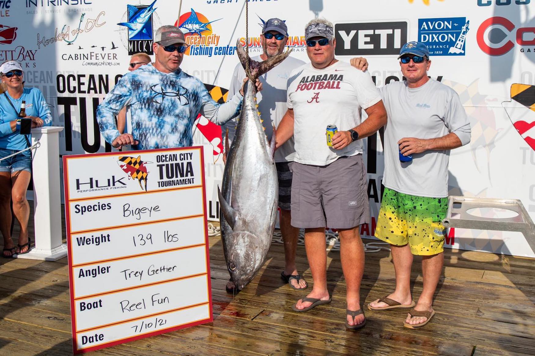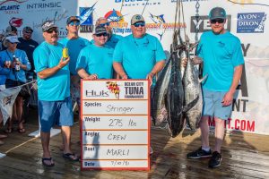 Day two of the 34th Annual Ocean City Tuna Tournament is in the books and it was a busy one because there was no day one. What was left of Tropical Storm Elsa had things roughed up out there yesterday so zero boats fished. That left two fishing days for all 106 boats to fish both Saturday and Sunday. It was a busy day at the scales and there were some very nice fish weighed….none bigger than the first fish to hit the dock! Here’s who’s leading what after one day of fishing. Thanks to Jake W. and the Ocean City Fishing Center for the pics!