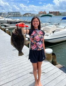 Ella Chan Carvalho (11), Newmarket NH, visiting her uncle & aunt Michael & Pauline Chan in OC caught this 16.75″ keeper flounder off of her dock by Bayshore Drive in Ocean City.