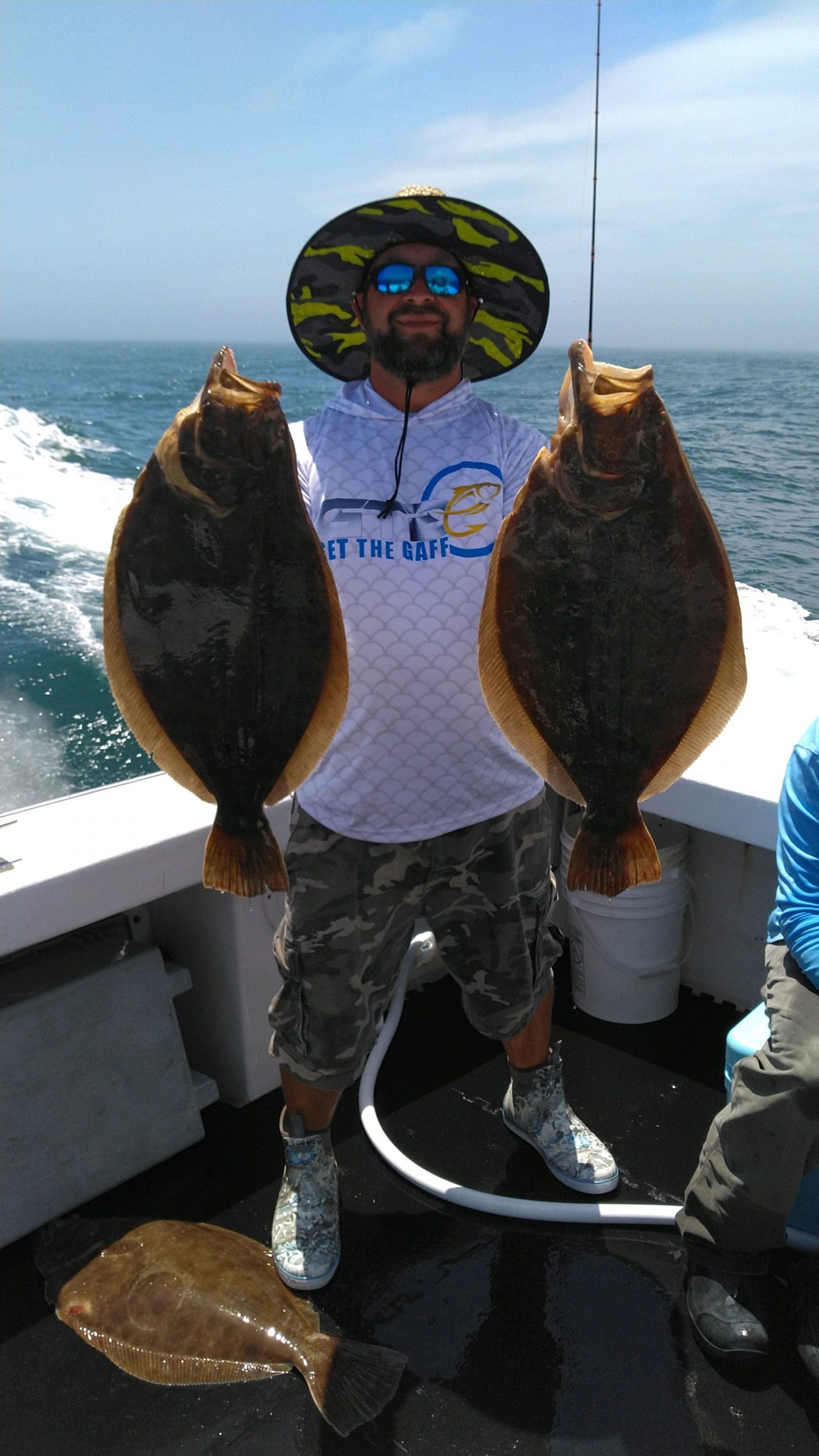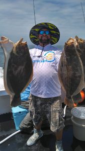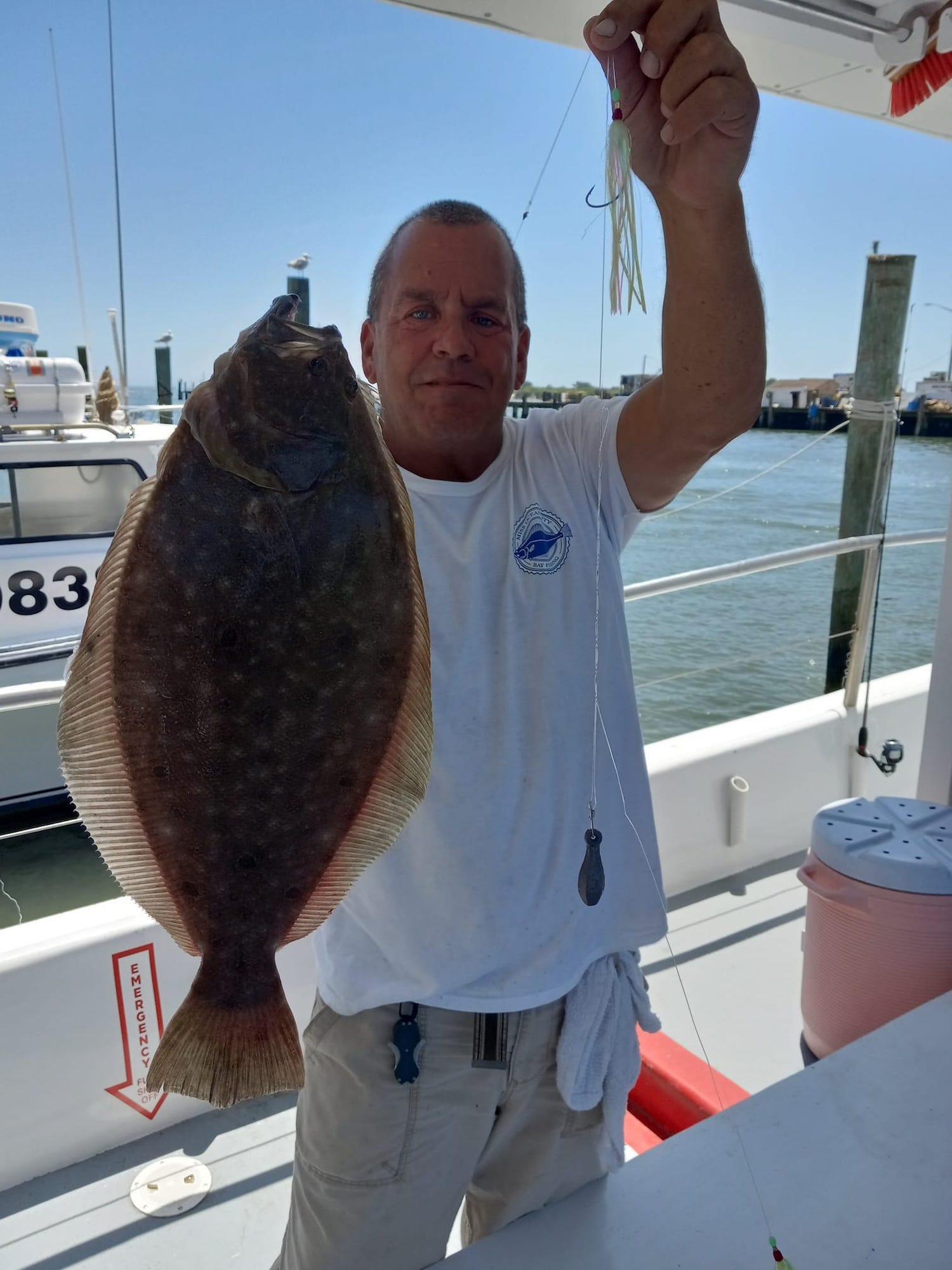 Mate Joey Abbatichio of the Miss Ocean City landed this big 24″ keeper flounder while fishing the Fish in OC Double Trouble skirted rig in chartreuse.