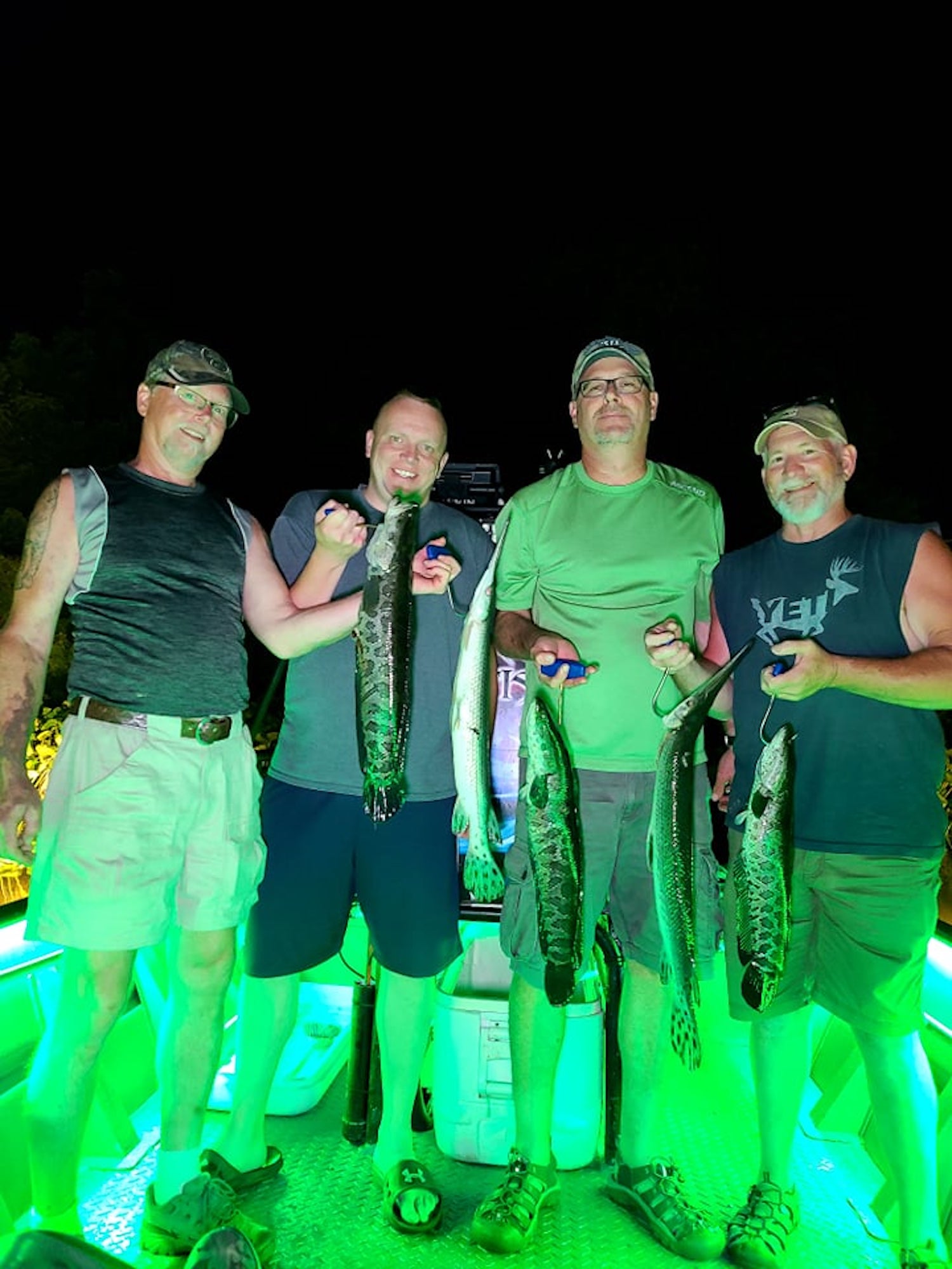 Captain Marc Spagnola has reached zombie status this season, but his clients certainly don’t mind. His shooters have been seeing great action both day and night for rays, snakeheads, gar and hound fish.