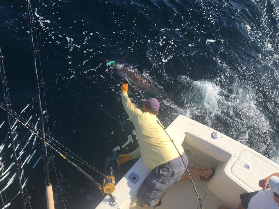 My buddy Austin Ensor was out in the deep today taking advantage of the nice sea conditions before tomorrow’s expected blow. Austin and the crew of the Primary Search boxed four yellowfin tuna and released an estimated 150 pound blue marlin.