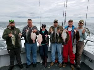 Captain Monty Hawkins of the Morning Star had some excellent fall fishing out on the rip today. Captain Monty reported that they had a bunch of sea bass limits today and that it was a nice bite in flat calm seas. Jack Derfler of Royersford, PA even managed a limit of fluke. Kenny Chrismond Of Glen Burnie, MD took the pool with a 19.25″ sea bass. Jack likely would have won with his 19 inch fluke, but Morning Star is running a ‘sea bass only’ pool now. Also Pictured are Michelle Mack of Seaford, DE – Ryan Lignelli from Mt. Airy, MD – Joe Lignelli of Queenstown, MD & Mitch Palmer of Wake Forest, NC.