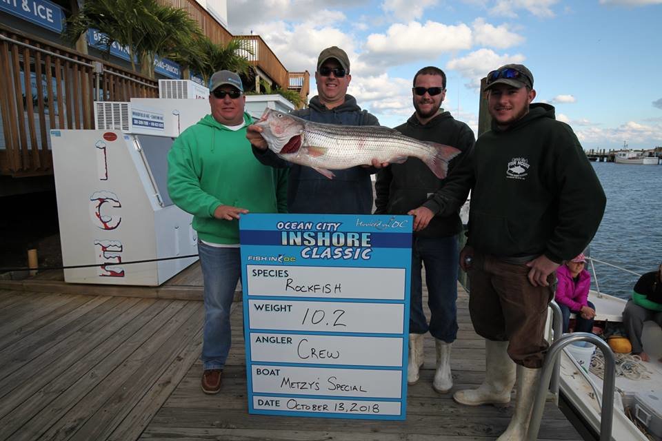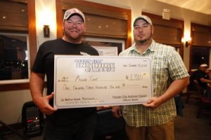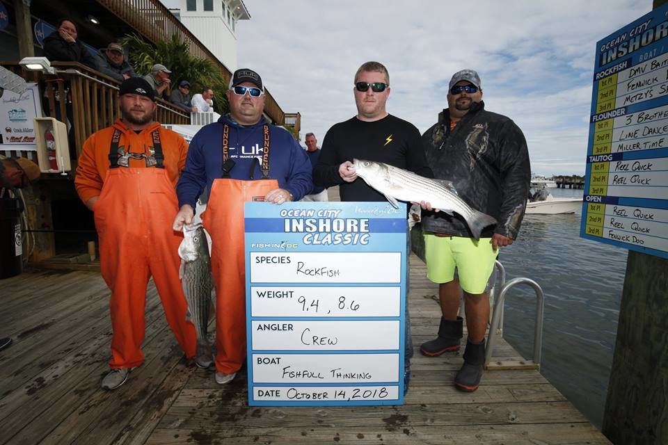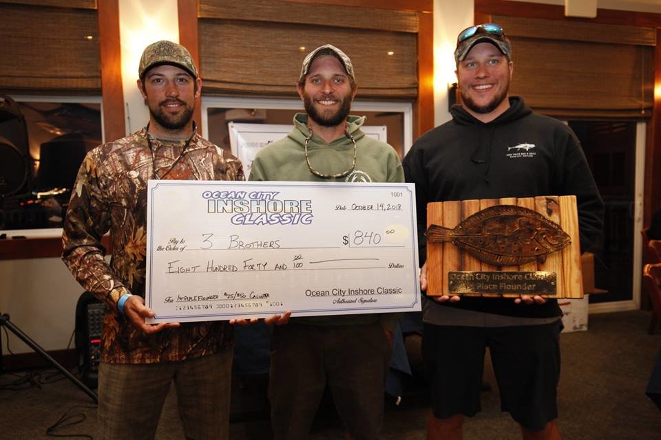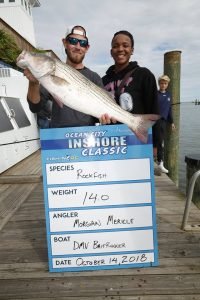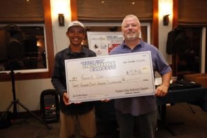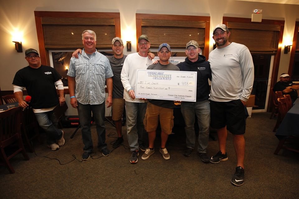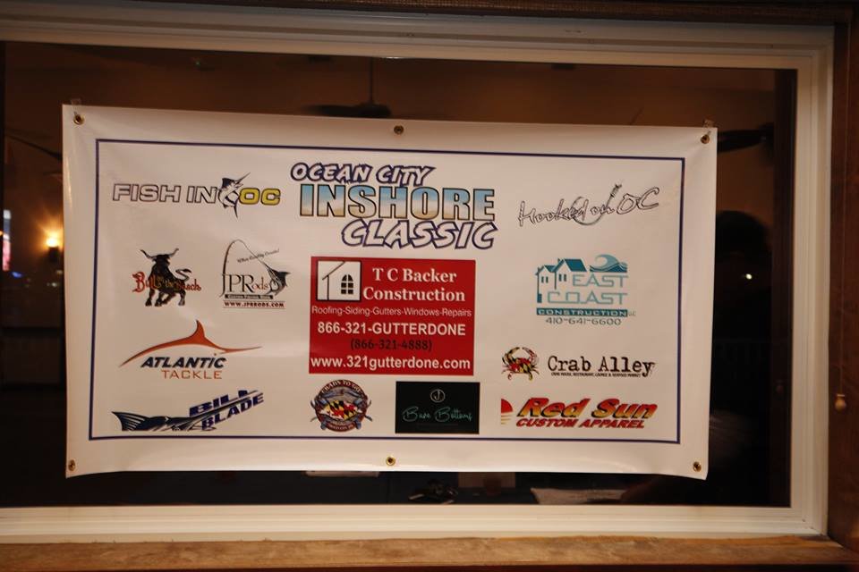 I just got back from the awards banquet at the Ocean City Marlin Club for our 2nd Annual Ocean City Inshore Classic put on by Fish in OC and Hooked on OC and I have to say it was an awesome event. We had 30 boats and 95 anglers, of which 9 were junior anglers, and we paid out over $9,200 in prize money. Everyone said they had an awesome time and I can speak for myself, my wife Kristen and Dave Messick and say we had an awesome time too! We couldn’t have done it without our terrific sponsors TC Backer Construction, Bull on the Beach, East Coast Construction, Crabs to Go, Bare Bottoms Boat Detailing, JPR Rods, Bill Blade, Red Sun Custom, Steel N Glory, Atlantic Tackle and the Ocean City Marlin Club. Big thanks go out to our official weigh master Dean Lo of the Angler for another great job this weekend. We handed out some pretty big checks tonight for a little inshore fishing tournament….here are the winners.