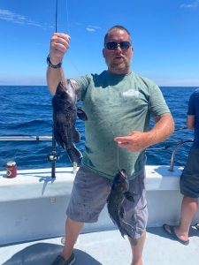 Captain Chris Mizurak of the Angler reported a finicky bite today, but after toughing it out got most folks a good catch of sea bass.