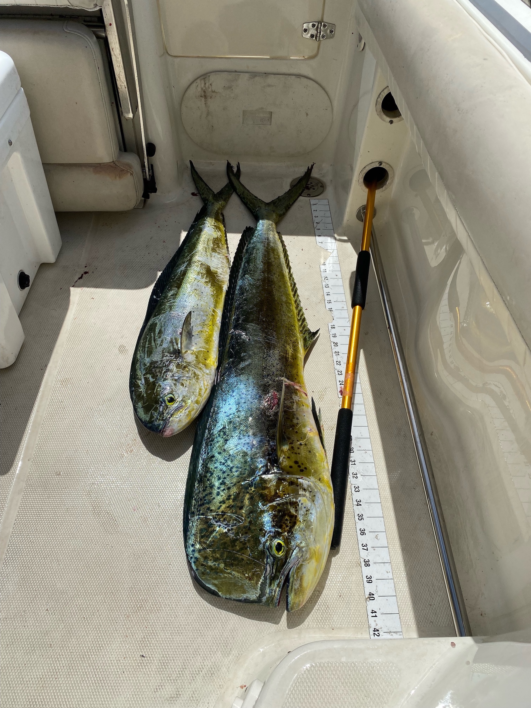 I got an absolutely crazy email from a reader and rig user with some great photos and a story to go with them. Dan Potter was fishing with Mark Carew from Newark, DE yesterday out over ocean structure using the Fish in OC Deadly Doubles in white and pink when they were surprised by two awesome fish. The guys were retrieving their rigs getting ready to head home when these beautiful mahi attacked their Deadly Doubles and took off for the sunset. Thankfully the smaller cow mahi ate the lighter rod and after a short fight they got the two fish to the boat. The larger bull was 45″ long and Dan estimated at 20 to 25 pounds. Awesome catch!!