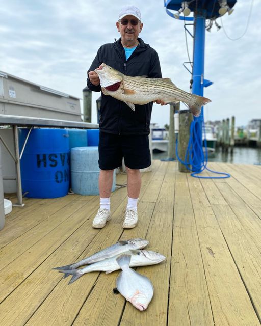 Captain John Prather of Ocean City Guide Service fought the difficult conditions and won with a keeper flounder, a legal rockfish and some bluefish.