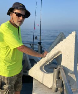 Not sure what name he’ll pick for the reef but Nicky Ferrara will be the guy who names it. He owns Bear Concrete. It’s his guys who have been sending a trailer-load of reef pyramids south almost once a week since spring – adds up!