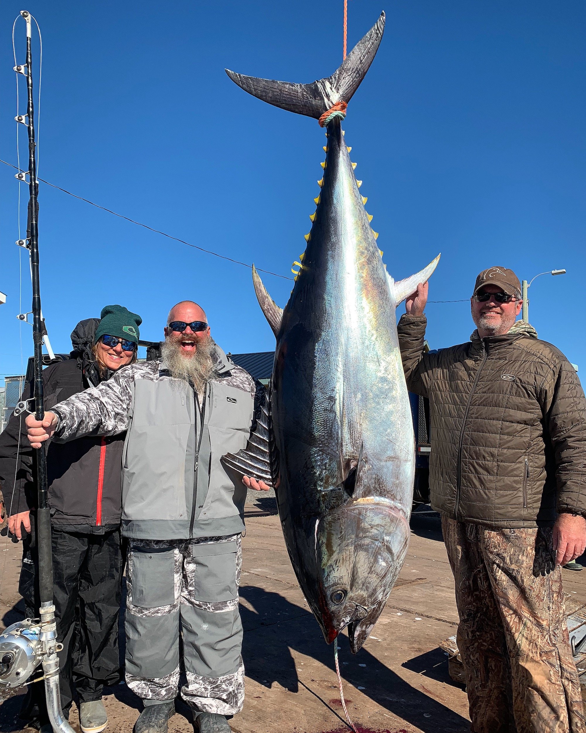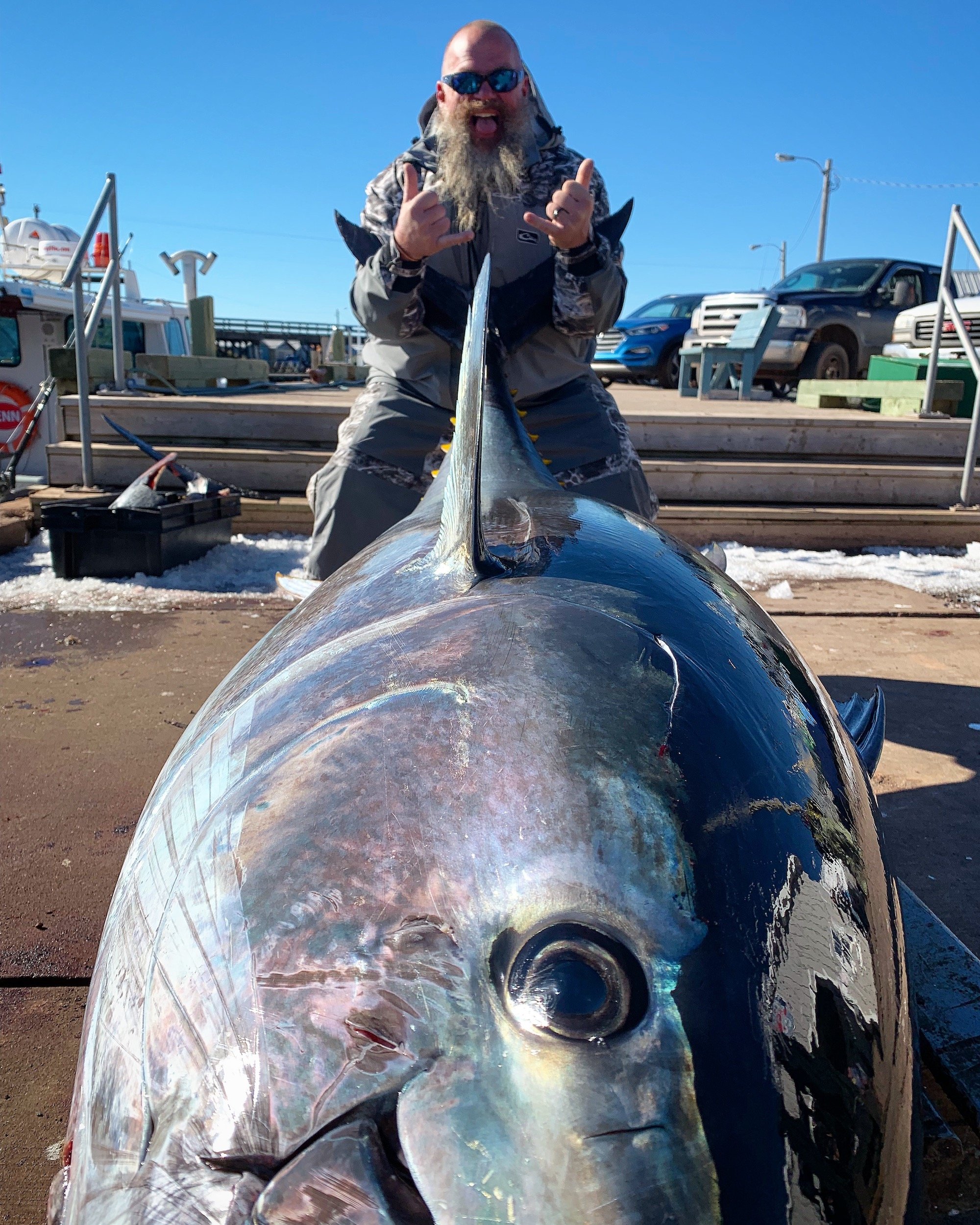 My buddy Captain Jeff Coats of Fish in OC inshore charter Pitboss Fishing made his way to Prince Edward Island Canada with his lovely wife Karen to do some goose hunting for Migration Nation and while he was there he got to do a little bluefin tuna fishing. Now that I think about it, “little bluefin fishing” may not have been the best choice of words because Jeff caught a BIG one. Jeff fished with Captain Cor Keus, son Captain Bruce Keus, Geoff Wood and Karen out of North Lake, Prince Edward Island Canada and landed a beautiful 96″ bluefin that weighed 551 pounds! He got some great pictures, but will be even more excited to see the video when it is aired for Migration Nation TV.