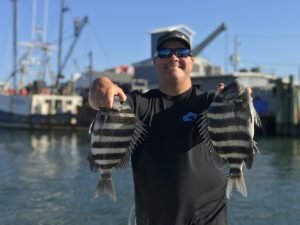 I got to have a pretty cool afternoon myself today as I was able to check another species off my list of fish that I’ve caught in Ocean City. I’ve been after the elusive sheepshead for a few years now, but haven’t been able to land one on several trips. That all changed this afternoon as I fished with Tommy Fowler of North Bay Marina and landed not just my first sheepshead, but also my second. We were also filming for our next episode of Hooked on OC and although I’m positive that it wasn’t as exciting as Jeff’s bluefin, it was still pretty cool. And sheepshead is delicious by the way.