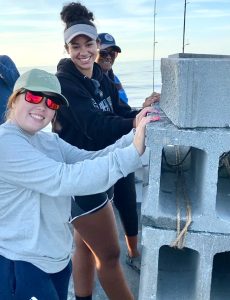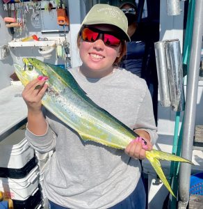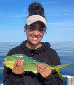 And a mahi fishing we went ..but not before local Delaware gals: Chelsea, Olivia & Michelle pushed today’s reef blocks overboard at Capt. Bobby’s Reef.