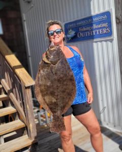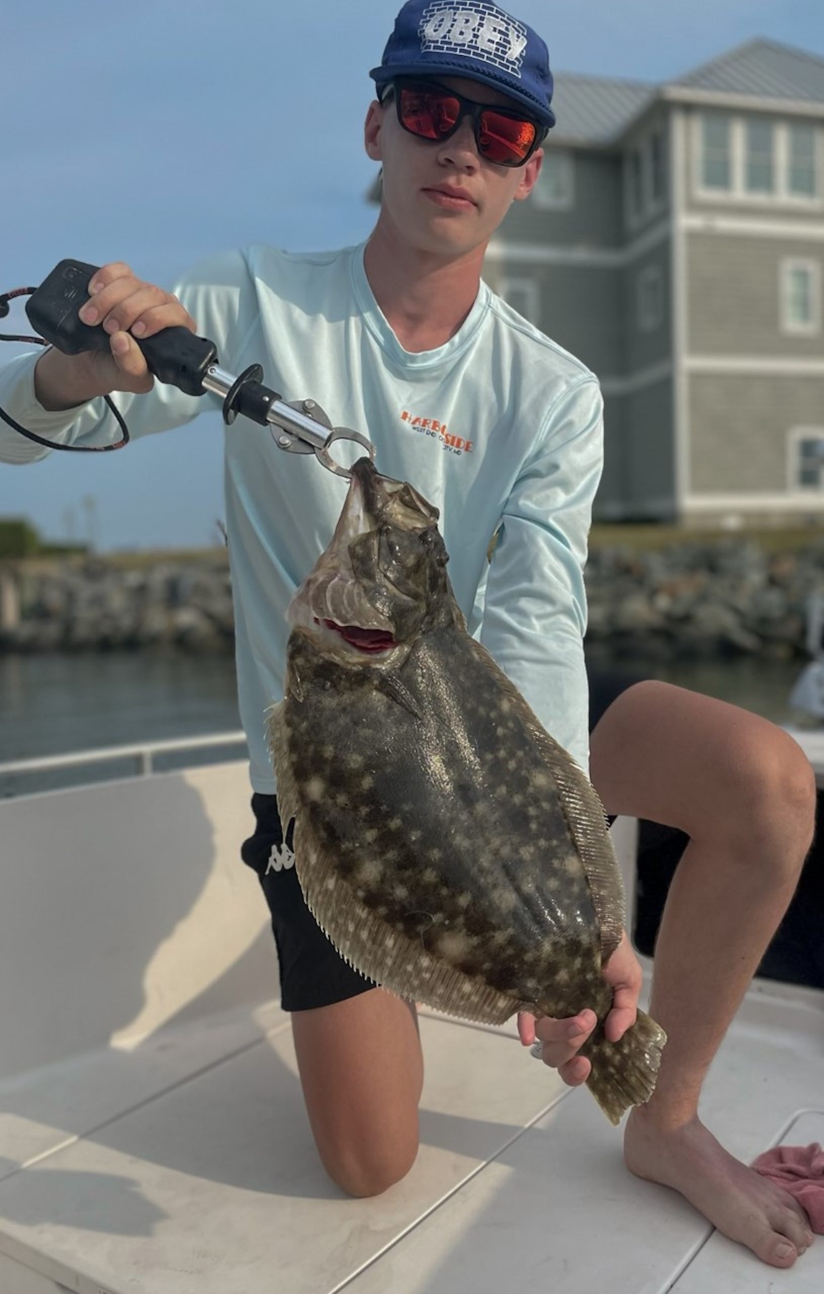 Alan Wrye caught his personal best flounder of over 19″ on a live spot while fishing with his son Luke.