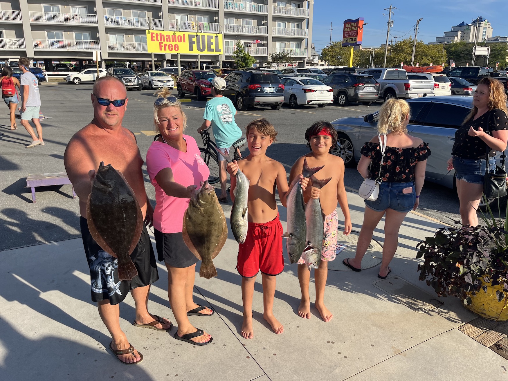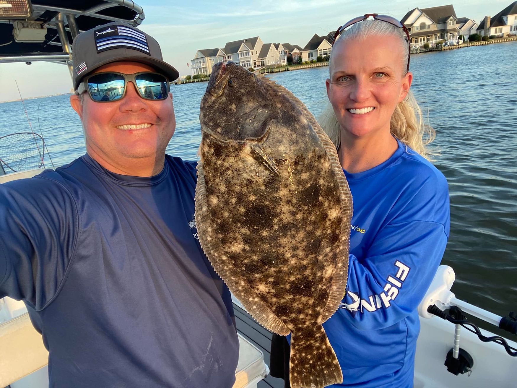 Another absolutely beautiful day in and around Ocean City with light winds, sunny skies and awesome temperatures. Weather wise, this has been a Labor Day to remember for sure! I was able to get out on the bay with Kristen for a bit this afternoon and after catching 10 or so throwback flounder I asked for one more drift. She obliged and with about 50 yards left to go I hooked this nice 23″, 4 pound flounder. Fish ate two small live bunker on our Fish in OC Live Bait Rig in 25′ of water.