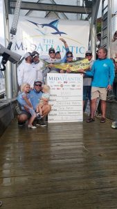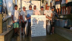 I just got back from an exciting day of scales action for the 2nd day of the 2020 MidAtlantic Tournament where the Hooked on OC team and I are broadcasting the event live at www.TheMidAtlantic.com  It was an eventful day with lots of scales action where we saw mahi, tuna, white marlin and one very, very big blue marlin.  The big blue marlin was caught on board the Shark Byte today and weighed in at Sunset Marina in West Ocean City at a whopping 791 pounds.  Unfortunately the blue marlin was slightly mutilated by…..here comes the ironic part…….a shark bite.  Yep, when the crew of Shark Byte got the fish boat side and actually had a gaff in it, she was bitten in the tail by a large shark.  IGFA rules state that the following situation will disqualify a fish…”Mutilation to the fish, prior to landing or boating the catch, caused by sharks, other fish, mammals, or propellers that remove or penetrate the flesh.”