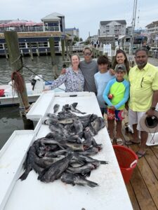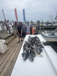 Anglers fishing on Chasin’ Tides with Captain Chase Eberle had two good trips with a limit of sea bass this morning and another 64 on the second trip.