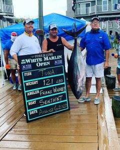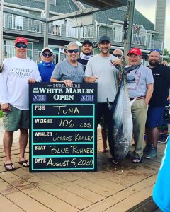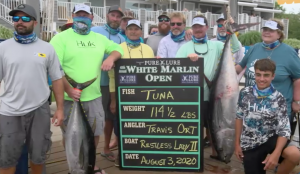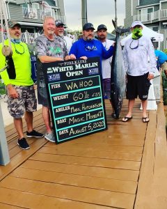 It was another busy day of scales action for what was the first Saturday that the White Marlin Open has ever had scales action. This year’s extended event ends tomorrow night and we have had some reel excitement on the docks at Harbor Island with big tuna, big mahi and now big white marlin. We had another 50 plus pound mahi hit the dock today and the limited spectators that were at Harbor Island erupted this afternoon when the Canyon Blues out of Ocean City weighed a 97 pound white marlin that is the third heaviest white marlin weighed in the tournament’s 47 year history. We also saw the first ever swordfish weighed in the White Marlin Open when not one, but two swords hit the dock. The larger of the two swords is not only leading the big fish category, it’s also leading the small boat big fish category and is currently worth $375,000. The big swordfish was caught on the Jersey Boy and they had a cool story to go with it that included a 3 1/2 hour battle on stand up tackle. It’s been an exciting week so far and with over 250 boats fishing tomorrow we could see another exciting finish. Here’s who is leading the 47th Annual White Marlin Open after 6 days of fishing.
