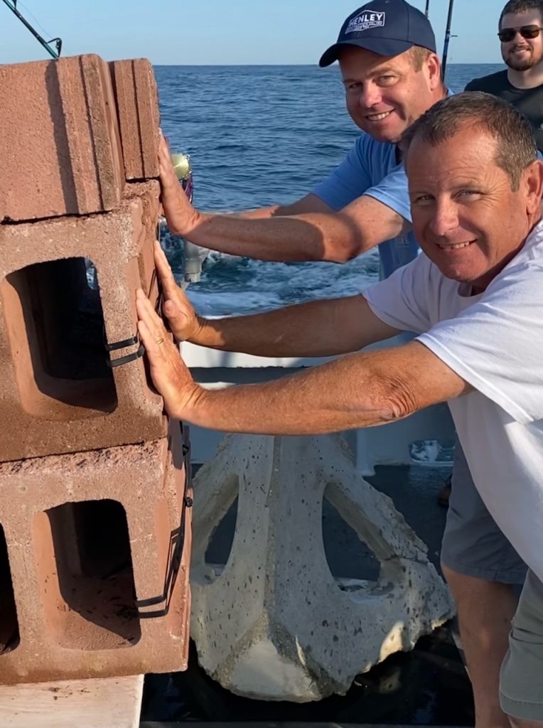 Block drop went swell at least. Twenty reef blocks from York Building Products & two pyramids from Gillis Gilkerson went by the aft rail with perfect accuracy.