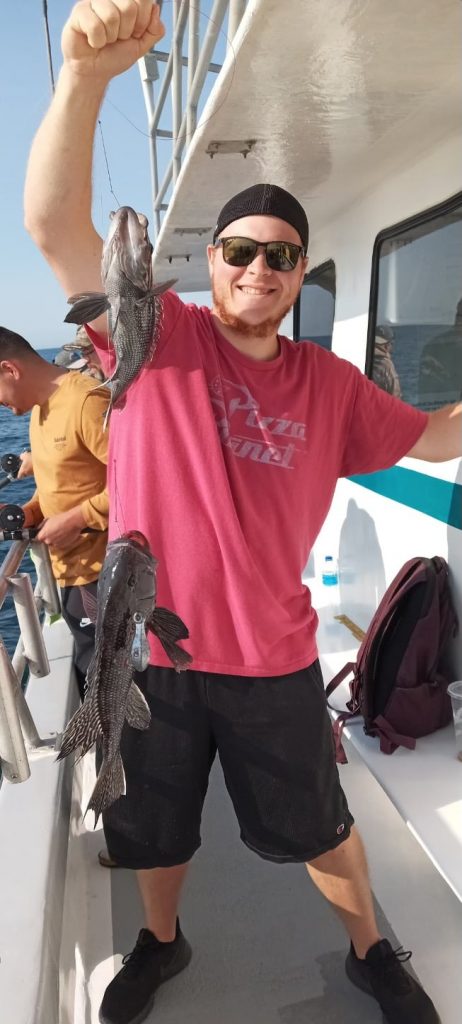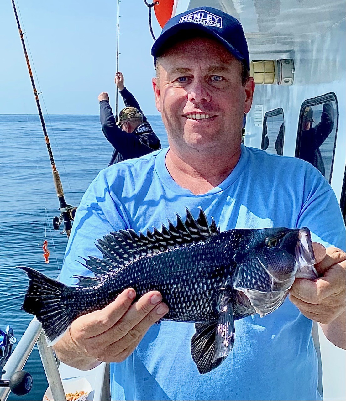 Day was well into OT before I had sea bass going for my clients. Banter at the rail and sea conditions were both pleasant. When at last some nice sea bass were added, a bonus.