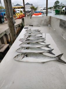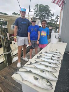 Captain Jason Mumford had his anglers under cover for some of the morning, but they didn’t mind since they were loading up on bluefish and a big 14″ kingfish.