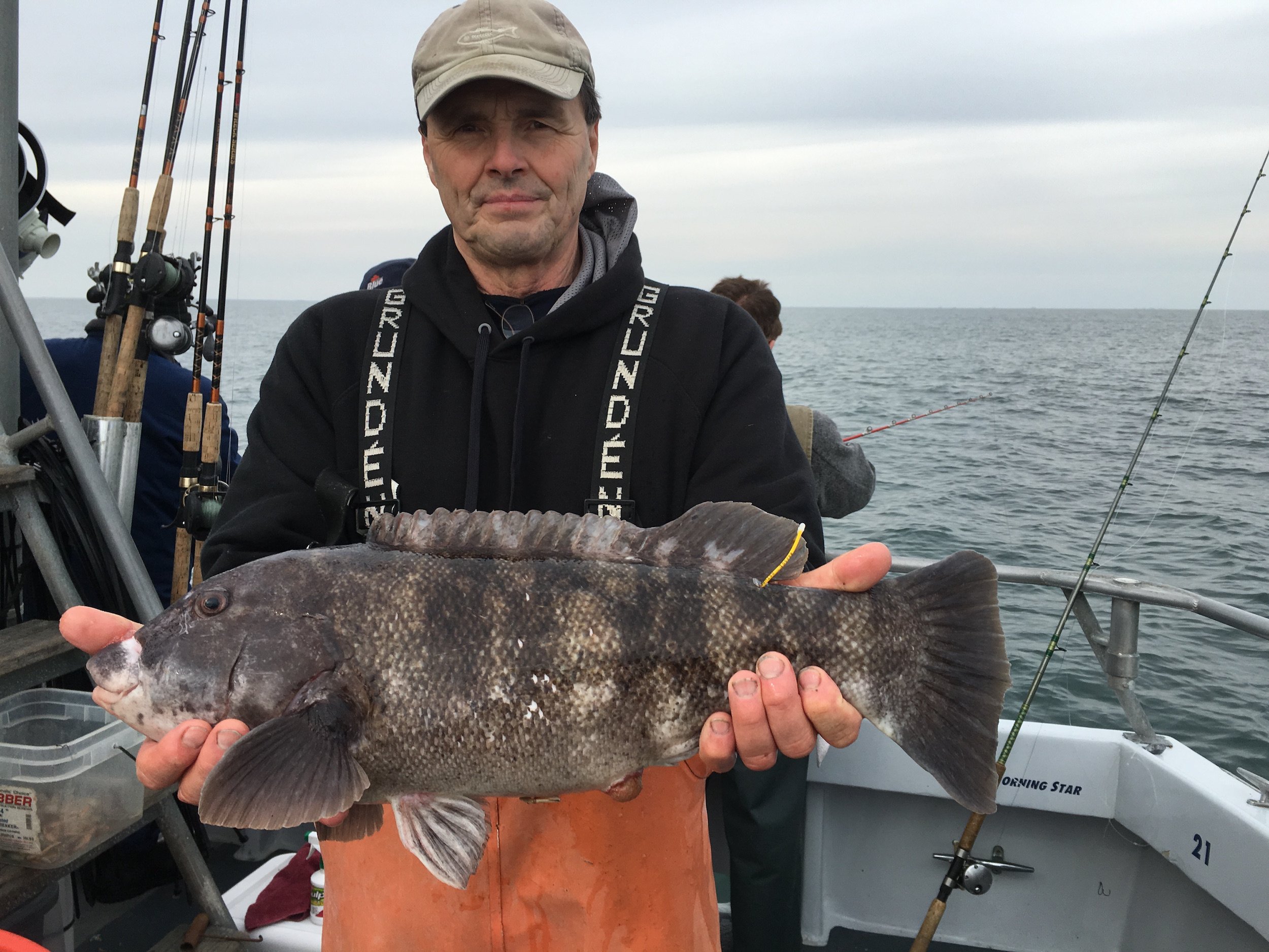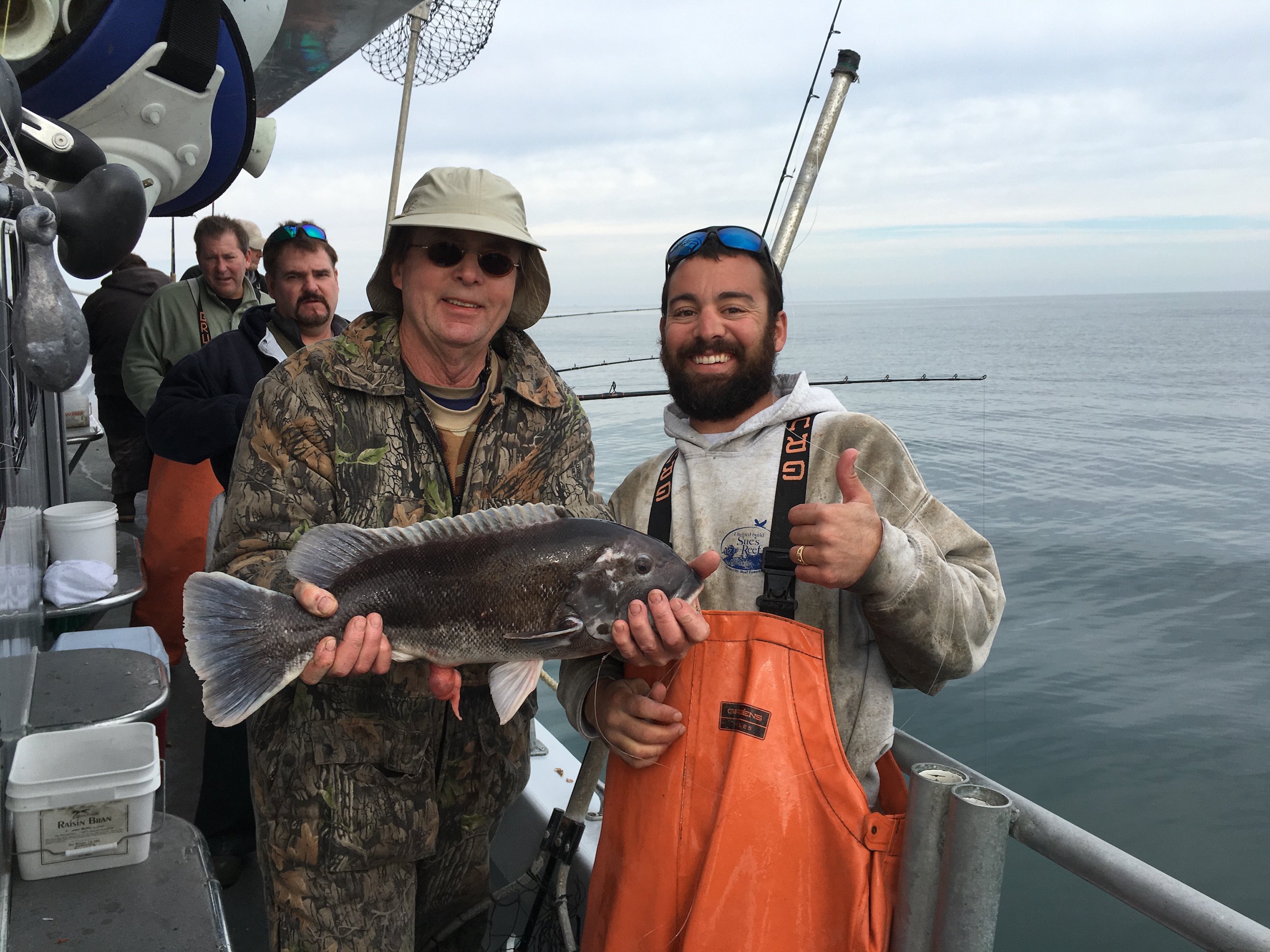 For the second day in a row we saw mild temperatures and calm winds and for the second day in a row Captain Monty Hawkins had the Morning Star out on the ocean in search of some winter tautog. Captain Monty reported that there was still no current to speak of today, but fishing was better than yesterday. Captain Monty’s first text came across at 10:45 with this photo of Dan and Danny with a nice male after just netting him. One client already had a limit by this point.