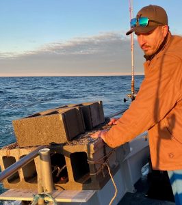 Kevin from Lewes DE did the deed on our half stacks – too choppy to make a single twenty reef block unit. Got em overboard with fine accuracy though and pressed on.