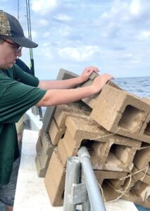 Beaten like agates in a rock tumbler, (see 13 sec vid) we arrived at today’s block drop where Warren launched 24 blocks by the stern rail at St Ann’s Reef. That pushed it across the 3,000 mark.. Now 3017 blocks there plus 17 pyramids and hundreds of 8ft concrete fence planks from way back. (Boy do I wish I could’ve taken all the planks that were available!) The east side of St Ann’s Reef was once almost completely sanded in. The block project’s been a fantastic success there.