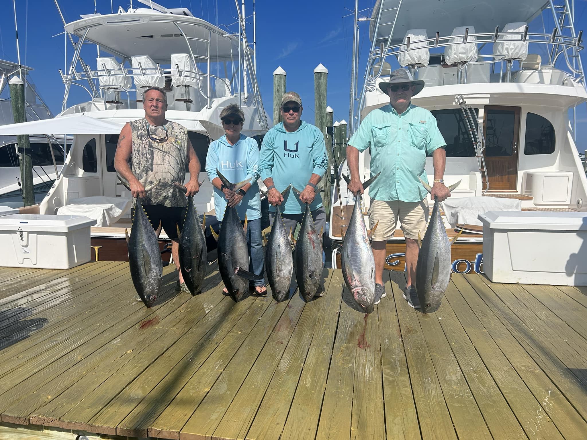 The crew of the Pumpin’ Hard with Captain Mike Burt and crew had a nice day offshore today albeit a little rough. The crew through a decent catch of yellowfin tuna on the dock at Sunset Marina.