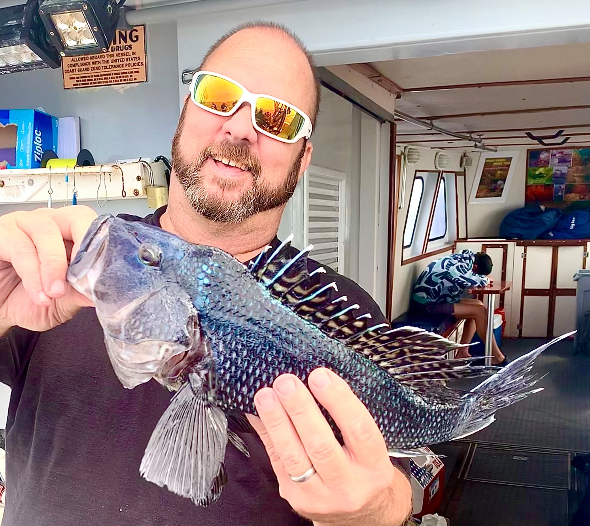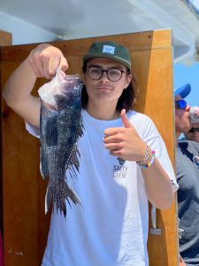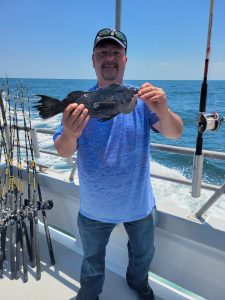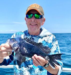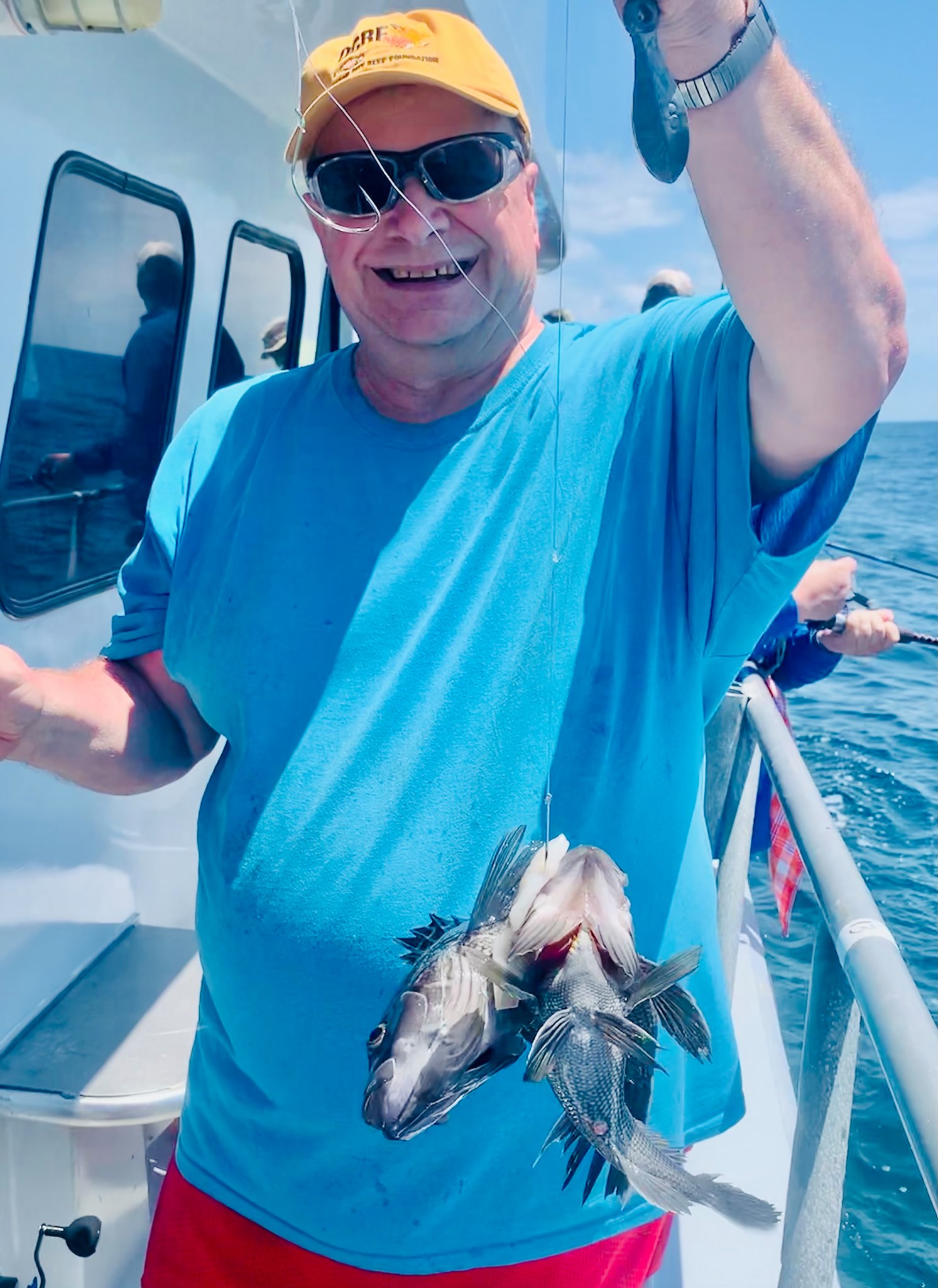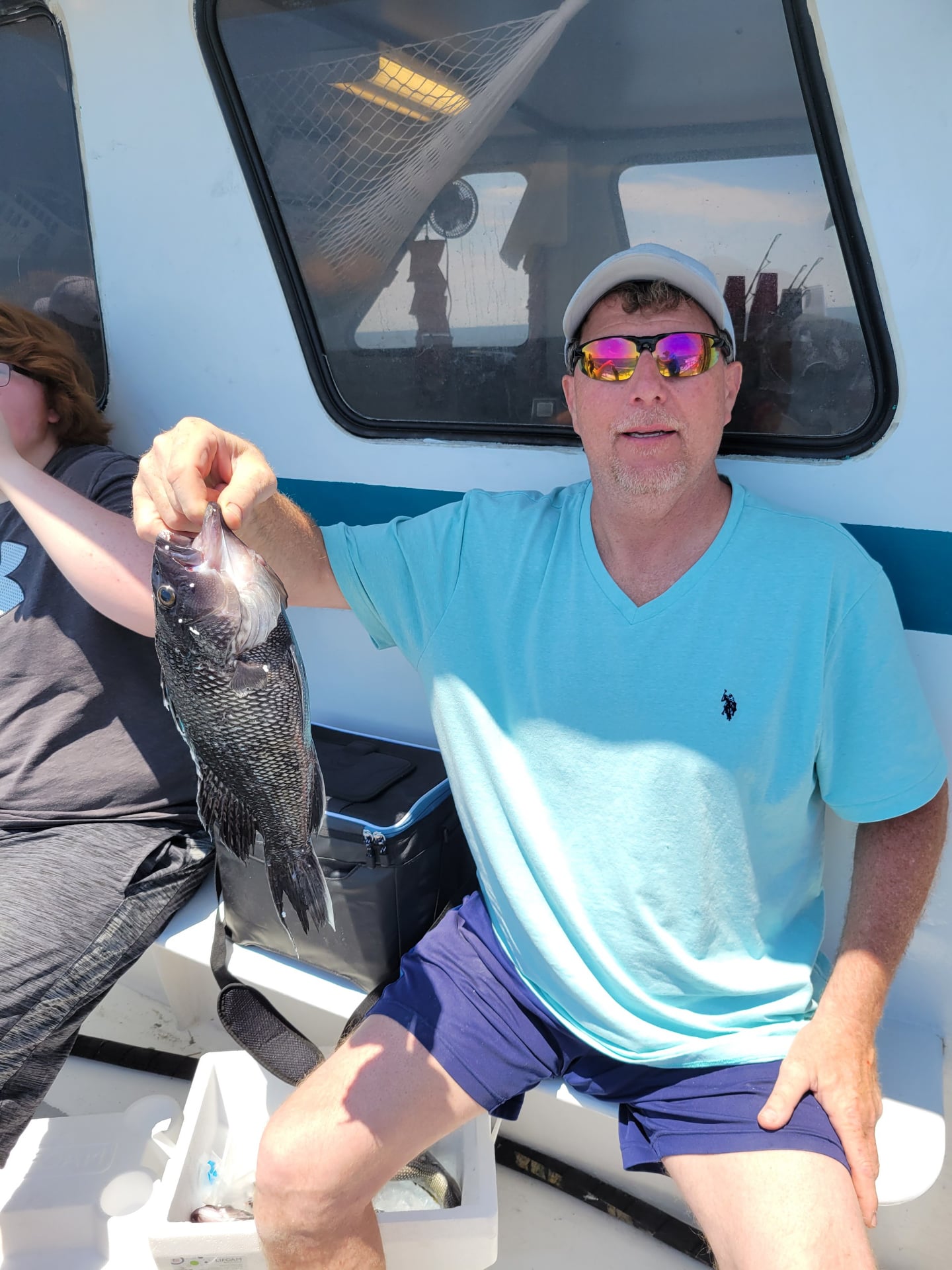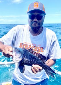 Cathy looked to be our first limit. Sea bass bite wasn’t what it has been. Weren’t awful either. Boxed our first limit well into overtime. It wasn’t Cathy – David Murphy of Elkton MD carried the ball across today. I’d seen Murray messing with candles and chicken bones atop Cathy’s cooler.
