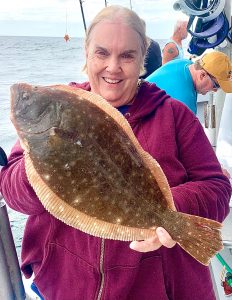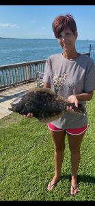 Damian McCallister of Celtic Nations Contracting reported in that Lori Wynegar caught this 21″ flounder from the bulkhead in front of their Cruiseway condominiums. Damian said that she released the fish because “she love fish too much.”