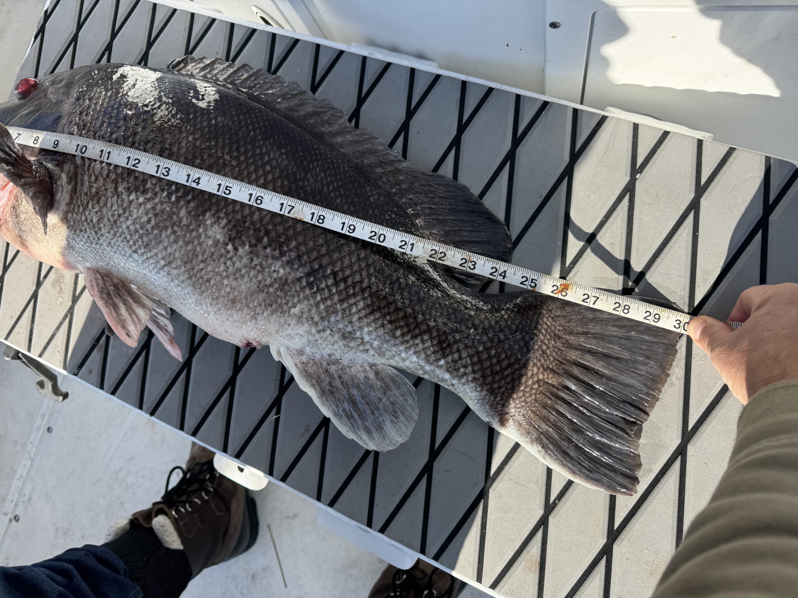 I had the opportunity to head out to the ocean for some bottom fishing with my good buddy Mike Johnston and my new buddy Slater White to do some tautog fishing for a new episode of Hooked on OC and we had an awesome time. It was one of the best days of bottom fishing that I’ve ever had with awesome weather, great company and absolutely insane fishing. We fished 130 feet of water out of Ocean City inlet and the day started with some very good tautog fishing. We used a combination of green crabs and white leggers on Deadly Tackle tog/bottom jigs and had a limit of fish. I beat my personal best tautog ever on my first fish with a beautiful 25″, 10 pound, 12 ounce female that went in the box and just a short while later I would beat that personal best with a really big female. A whole green crab on a 3 oz orange Deadly Tackle jig tricked my new personal best tautog into the net after a tug of war. After a quick measure and weigh I released the 30 1/8″, 15 pound, 12 ounce girl and she swam fast to the bottom to live another day and propagate the species.