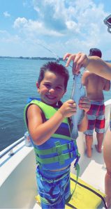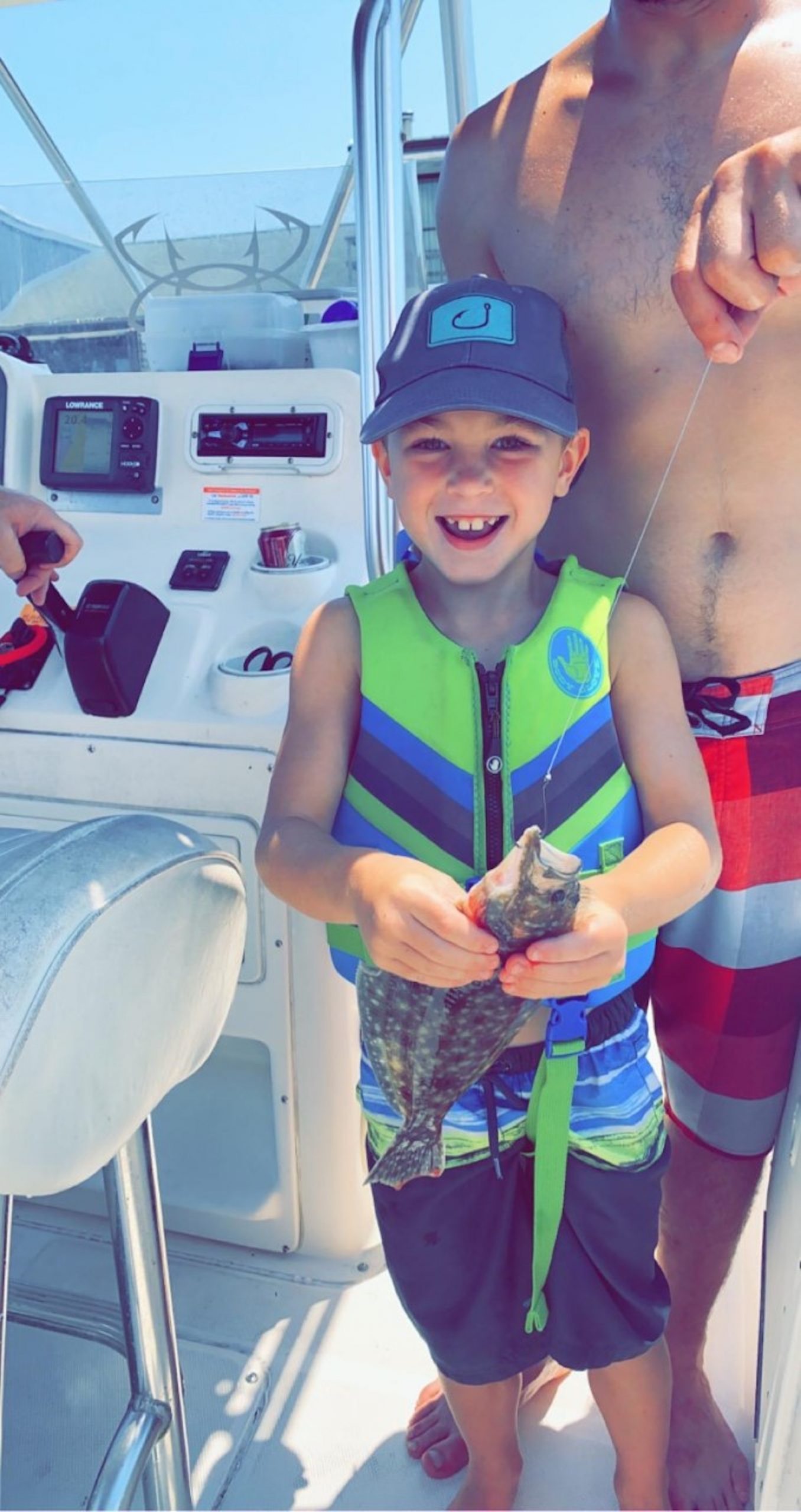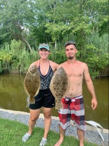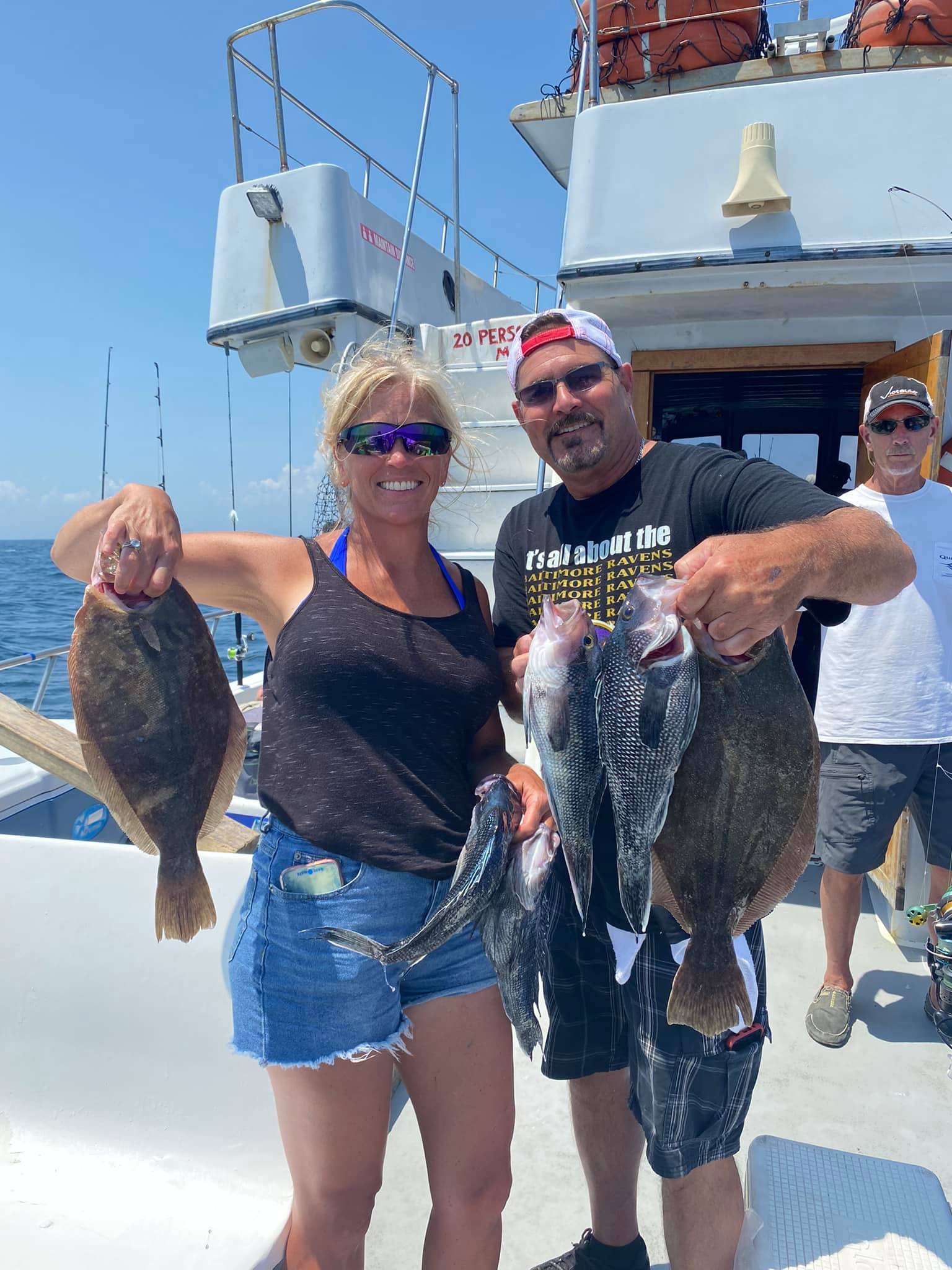 Faith Biesecker and Travis Hudson caught these 17″ and 18″ keeper flounder on the boat Line Dancer in the East Channel. Also pictured are Slaton and Easton Hudson.