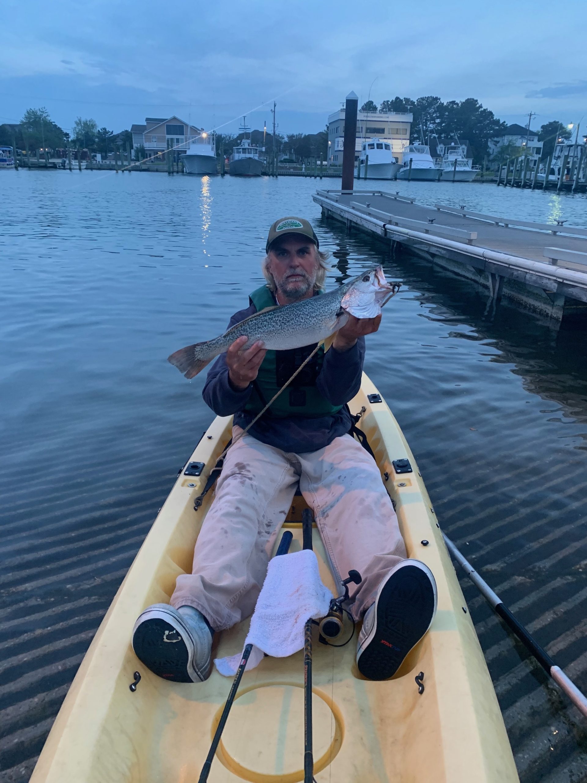 Shaun Flaherty was at it again this afternoon paddling his kayak over to Assateague Island to chuck some Roy Rigs. He was rewarded with another weakfish (grey trout) that measured in at 25″.