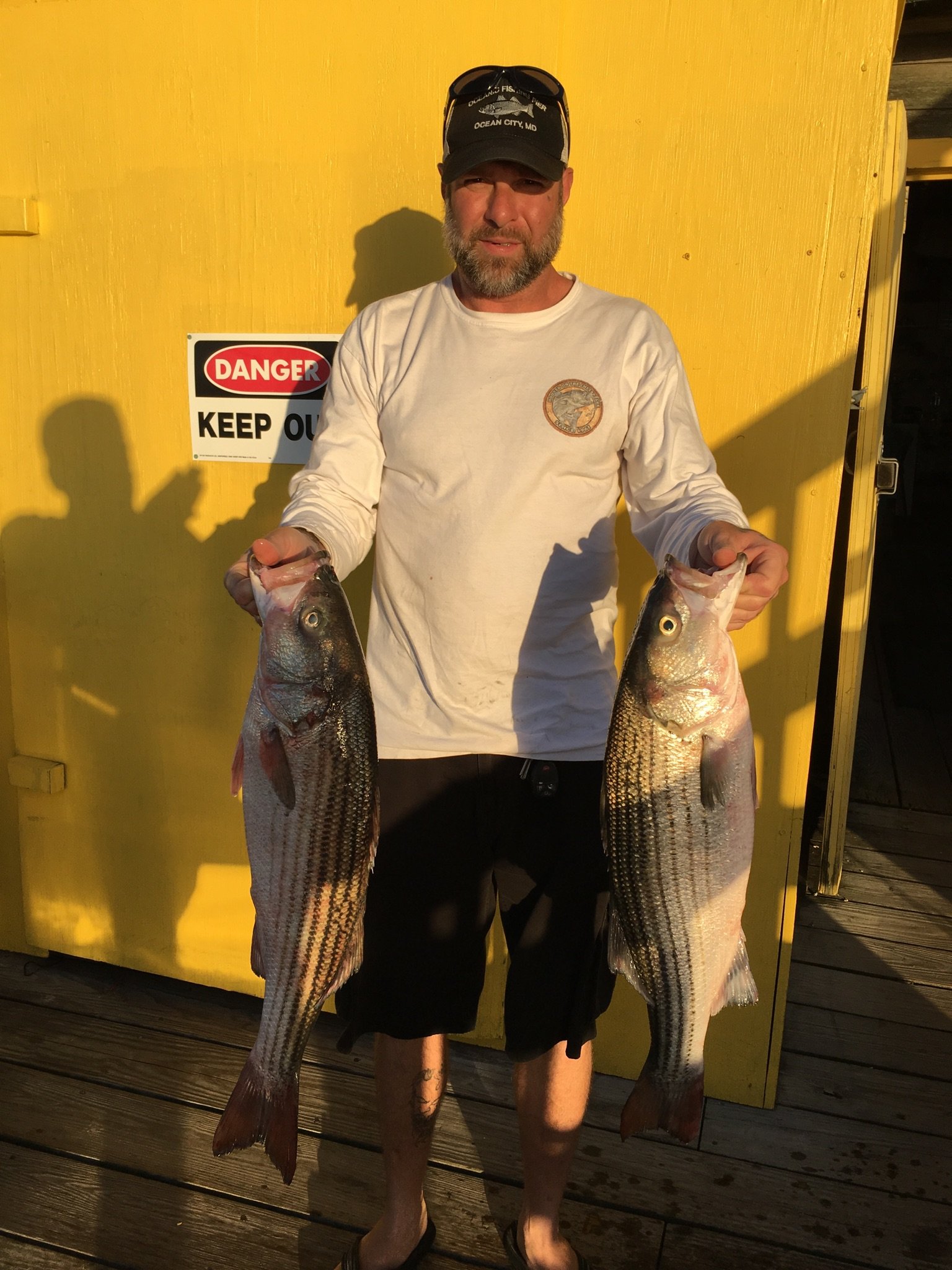 Fishing down at the Oceanic Pier has been really good the past few days too. Bear submitted photos of a keeper tautog from the pier, a shot of John with two keeper rockfish caught on Zoom baits and a photo of himself with a 19″ keeper flounder that he caught on a live minnow from the pier.