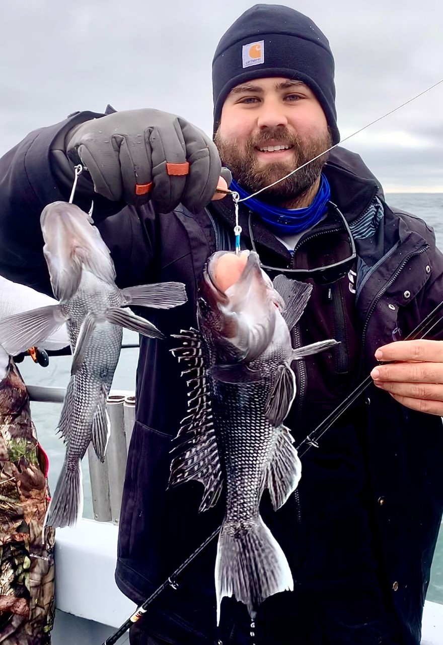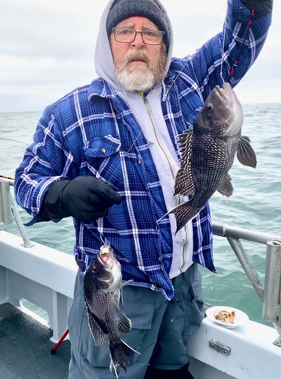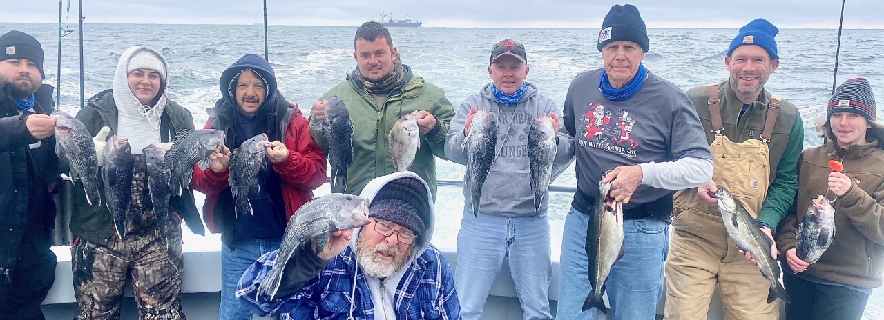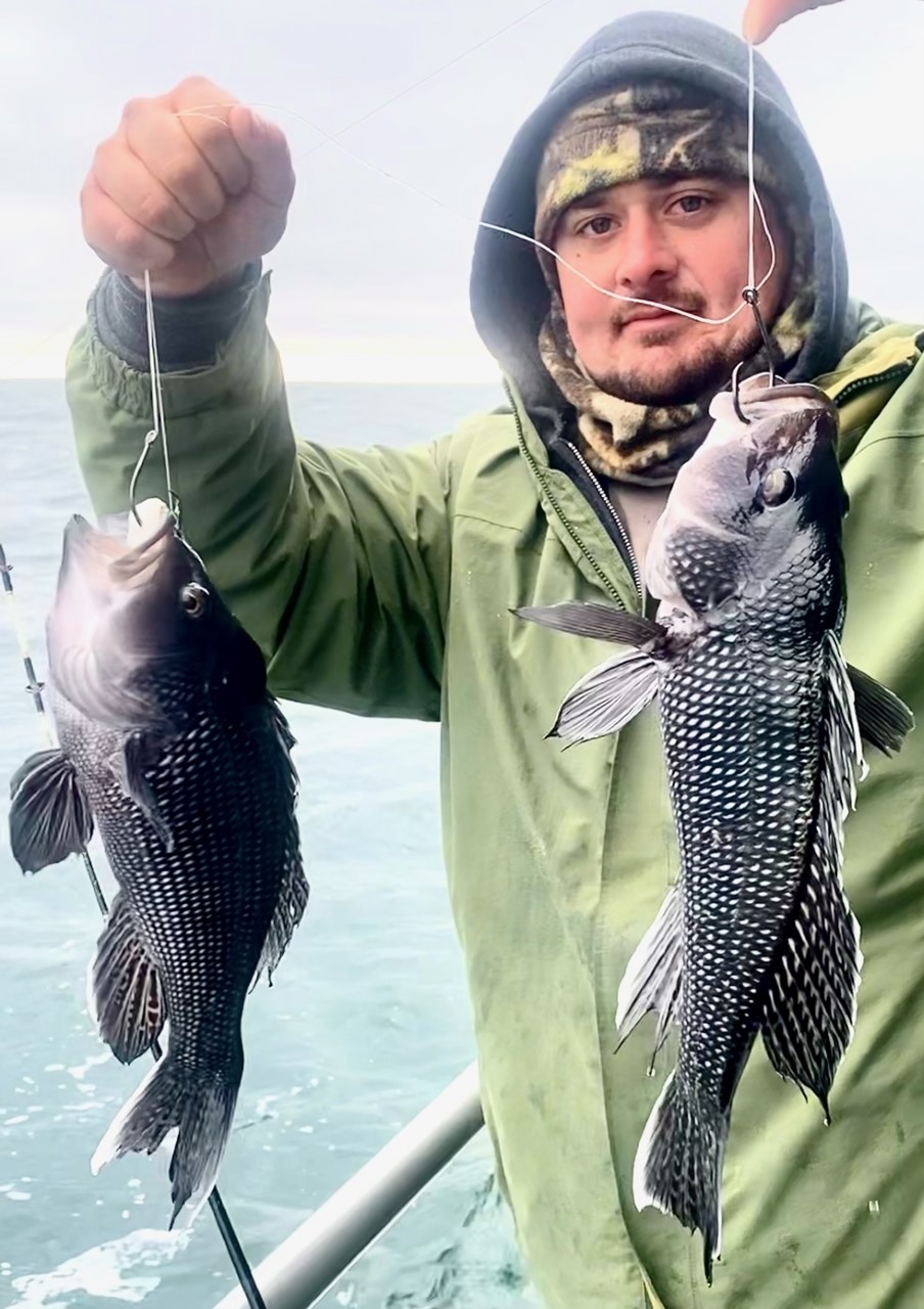 Captain Chase Eberle of Chasin’ Tides Charters had some good fishing today as well that ended with a limit of sea bass for his crew along with some keeper bluefish and tautog.