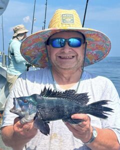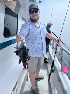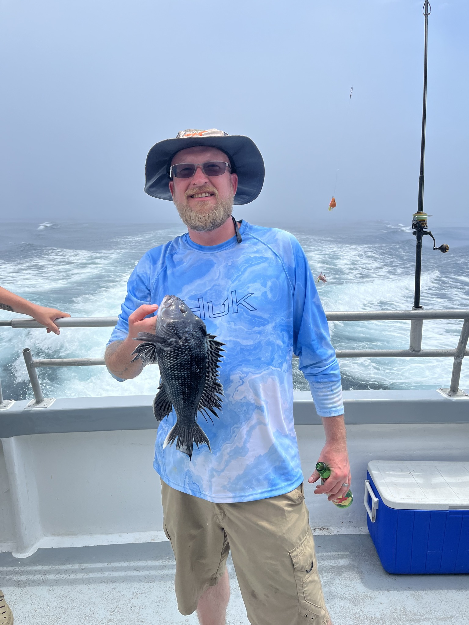 Sea bass fishing favored hard workers today. Ms Holly was high hook with 9 fat bass, Joe may well have tied her in a shared cooler with pool winner Wilfredo. That’s good fishing for 24.