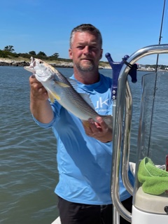 Joel Mick evened the score with his wife Michelle today catching a keeper sea trout of 19″ and a keeper flounder of 17″. He earned the right to hold his own fish.