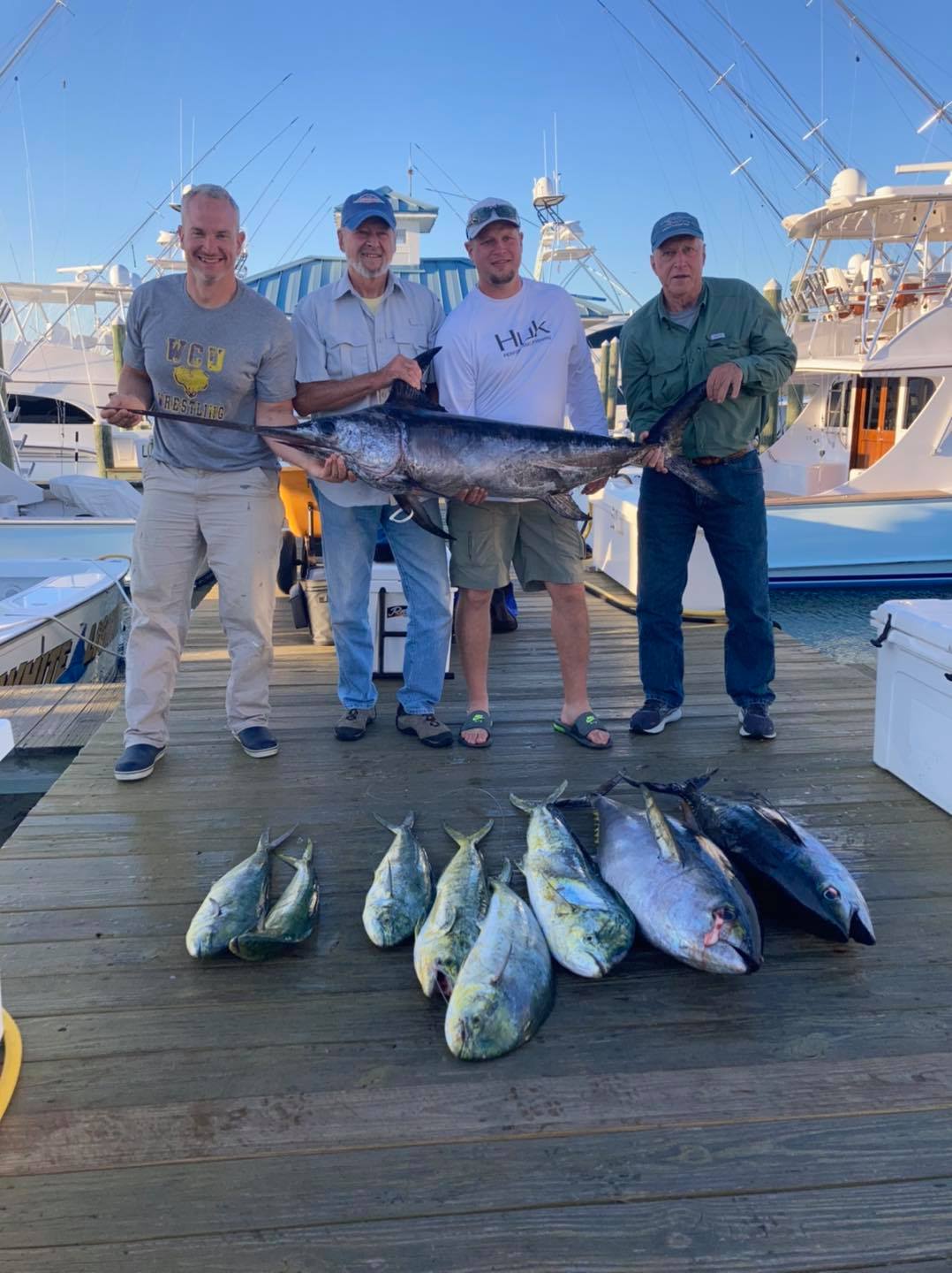 Anglers on board the Pumpin’ Hard with Captain Mike Burt had a great day offshore today with yellowfin tuna, a couple of mahi and a keeper swordfish for the photo op.
