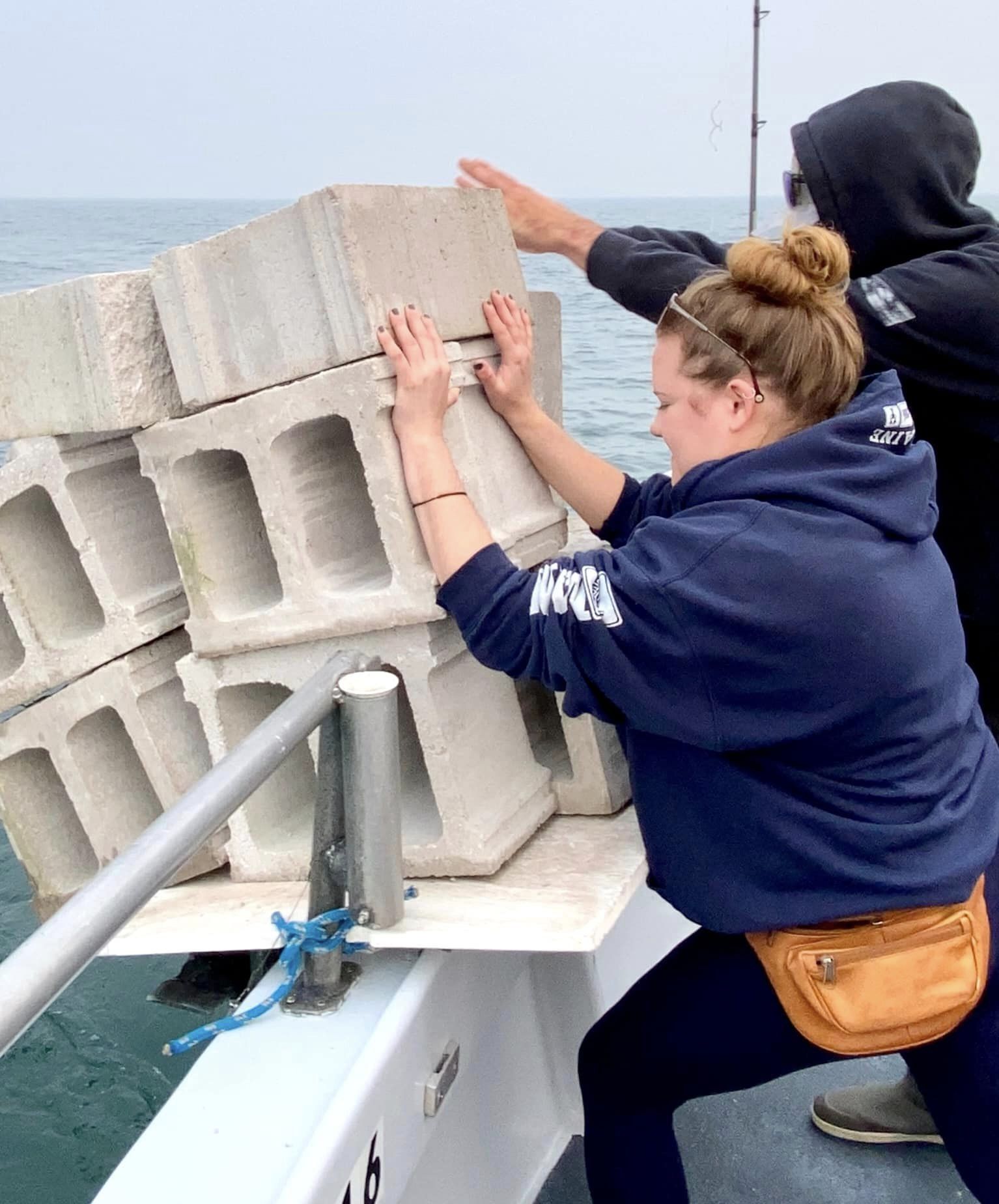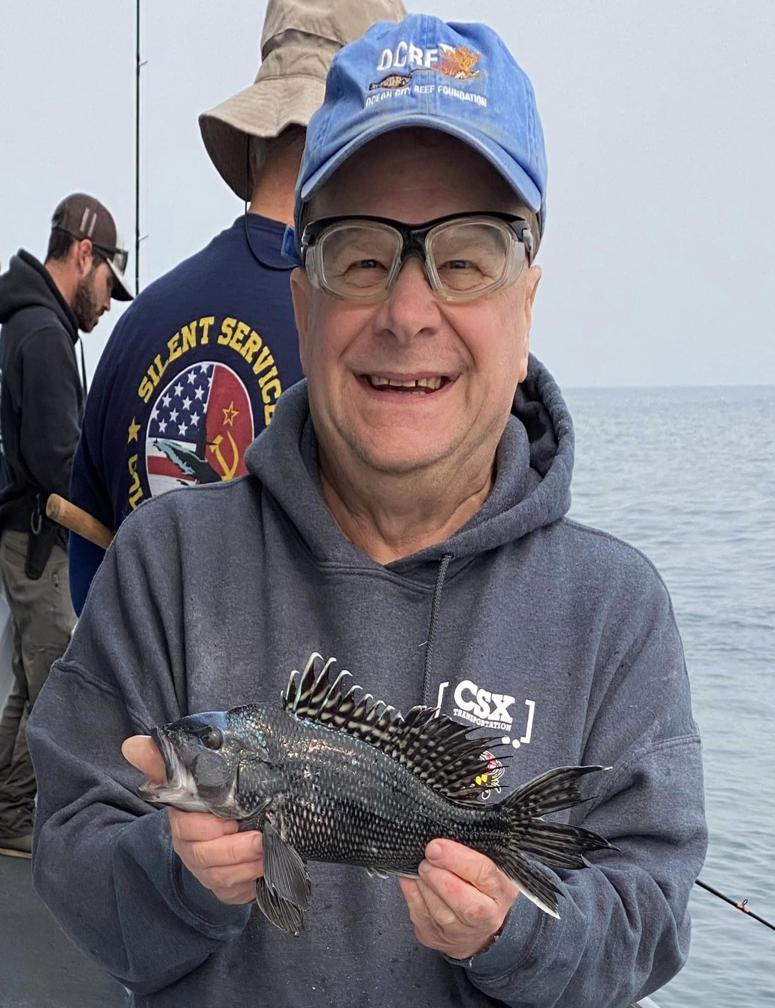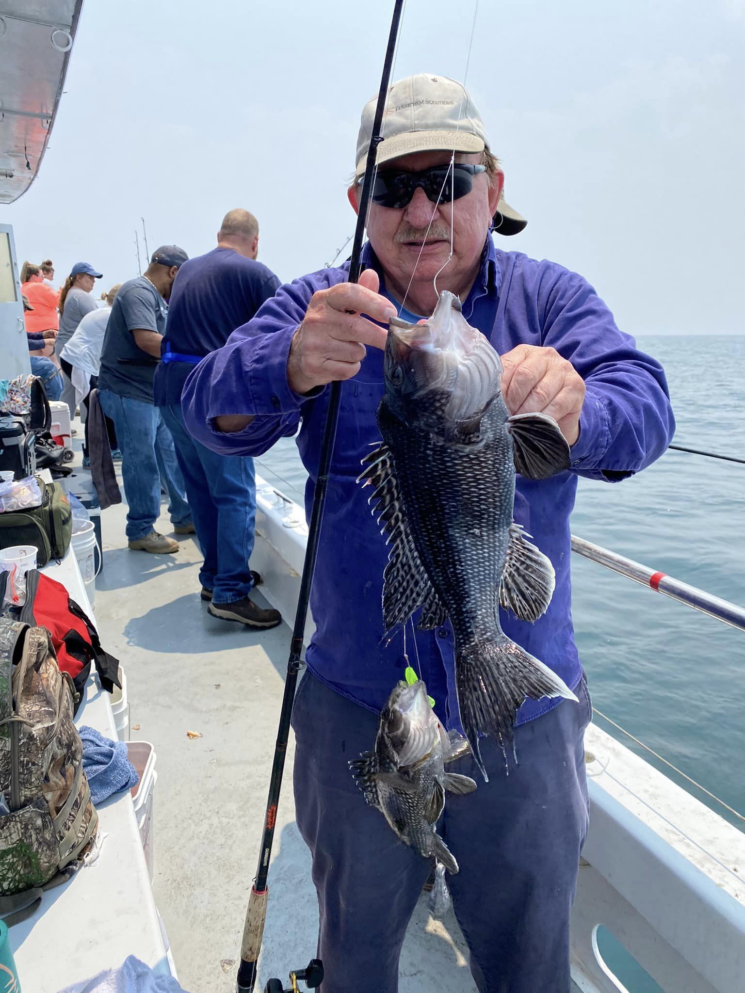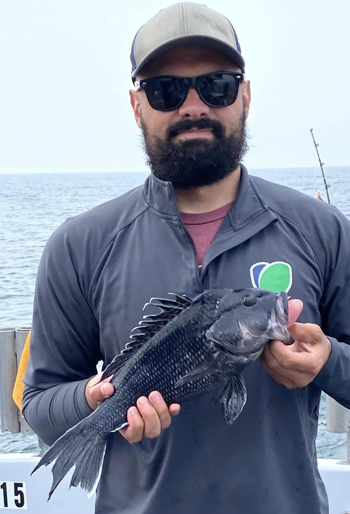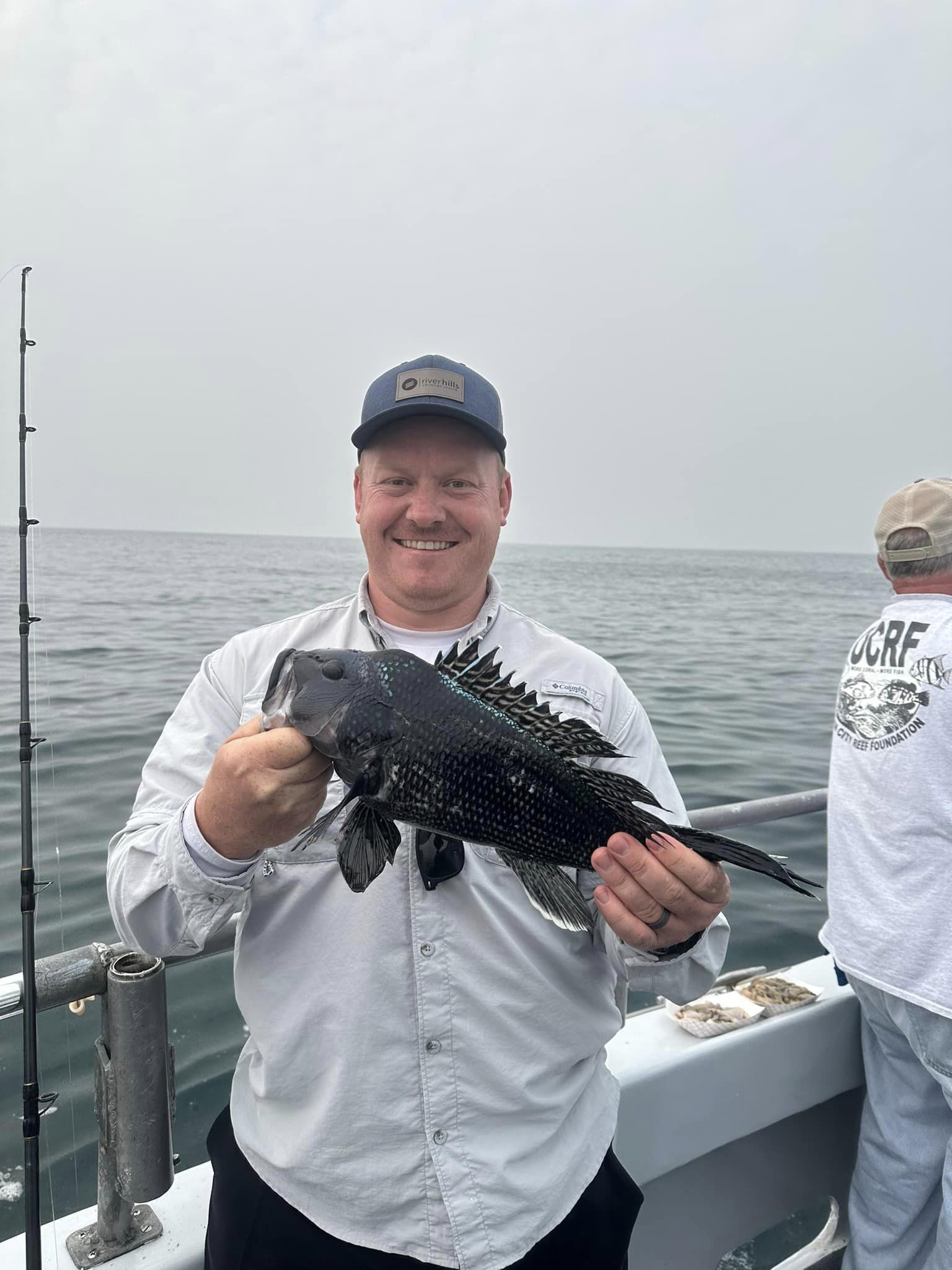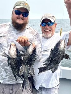 CalmCalmCalm.. Pretty as you want in this morning’s Canadian haze. How very different the later part of this day would become. Slipped on off to Tyler’s Reef first thing and sent 20 loose reef blocks to the bottom. They make a flat steel surface much more biologically productive – incredibly so. Sea bass were some fussy for my clients today. Yesterday seems a cake walk compared to this. Numerous times I marked sea bass well only to have precious few bites.  WorkWorkWork!Sheww.. Still, some folks ended up OK. Had many nice bruisers aboard. Brett from Cincinnati took today’s pool money. Though we got in an hour and a half late I’d have probably stayed longer still ..except for a large red dogleg on my  long range radar scan. I held course 35deg south, but it was no use. Turned up into it to face the music.Pretty sporty for us. Thirty knots from flatflat calm will get my attention. Others had more wind though, I’m sure – hail too. Gee, sorry we missed that part! Whole lot of this water is tied together in more ways & way more distant than most would imagine. A fellow caught a bluefin tuna with forty sea bass in its belly just the other day. A barge carrying 450 reef pyramids of my design, 120 reef balls plus some concrete pipe is headed for Maryland’s southernmost artificial reef. Related? Will be..Though hundreds of miles apart as a fish swims, in a few years water quality where that BFT was hooked will be a little better because of reef material being deployed by CCA MD today. The mid-Atlantic has become greener and greener since the 1960s. Deep blue sea? NaMate. She’s Green. Today we see down a few feet. Not fathoms. We can and will change that. Oyster restoration is 100% the main part of the plan. With all these efforts for oyster restoration combined we might just see a fantastic increase in marine water quality off here soon. Will eventually for sure.I expect it’s already begun, really. What CCA MD is doing ensures it. CheersMonty