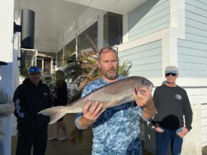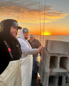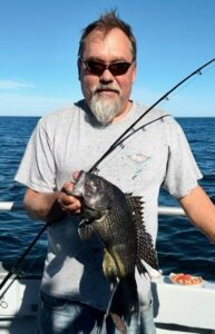 Underway before dawn; cleared the inlet & found another calm sea. Not slick calm like yesterday, but it would work. Paddled on off to Lucas Alexander’s Reef where Capt. Chris and mate Tanner, on busman’s holiday, struggled mightily to get our special helium infused ultra light reef blocks over the stern rail. (Yeah, ummm.. That may not be exactly accurate. Fresh out of HS football, Tanner was working my deck when reef pyramids were brand new. Instead of running a 2×4 thru a 170lb pyramid unit and splitting the load with Jonah, Tanner just picked em up himself to straighten the lot. I didn’t let him do it anymore, but it sure didn’t trouble him. It would be more accurate to say, Capt. Chris and Tanner LAUNCHED the reef blocks by the stern rail..) Sure was a lot of shorts today. Fall can be that way. Left my first spot with great confidence in my next ..and was reminded of another denizen of our reefs come fall – bluefish. Dern things. Did my best to get away from em. Wasn’t working. Long time since I’ve been run off a reef by blues. One heck of a monkey wrench in our day. Not without hope; Sea Bass Bob was, as his moniker would imply, limited. Another fellow was in double digits. Not for lack of skill, most clients were lagging. Boxed a few blues for the smoker and pressed on. By day’s end Cathy had won the pool hands down, Tanner and skipper Chris would limit; a few other folks got into double digits. I’ve been spoiled of late with boat limits. Tried like heck to do it again – a struggle instead.. Yesterday Vic managed to catch three small warblers and a junco that we caged and released once ashore. Presumably young of the year; birds must get blown offshore by the many thousand when it comes a hard westerly wind. Not restricted to little fellows. Have picked up thrashers and have even seen canada geese way off the beach after a wind.Thought we might have another round of worn out little guys today – but no. Saw about a dozen completely given out , floating, and soon to join the marine food web in some fashion. After three days of wind, exhaustion appears to occur at about day 5. Nature’s way is not always kind. Ah well, hope my bluefish dues are paid in full. Tomorrow’s another day!CheersMonty