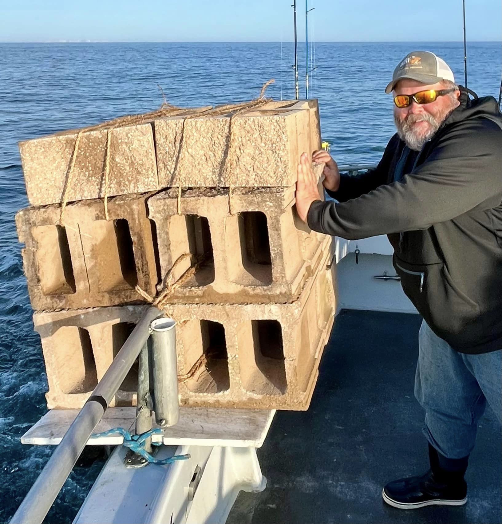 A later start than hoped, Big Jon gave 24 reef blocks a shove atop Capt Bob’s Reef and off we went.